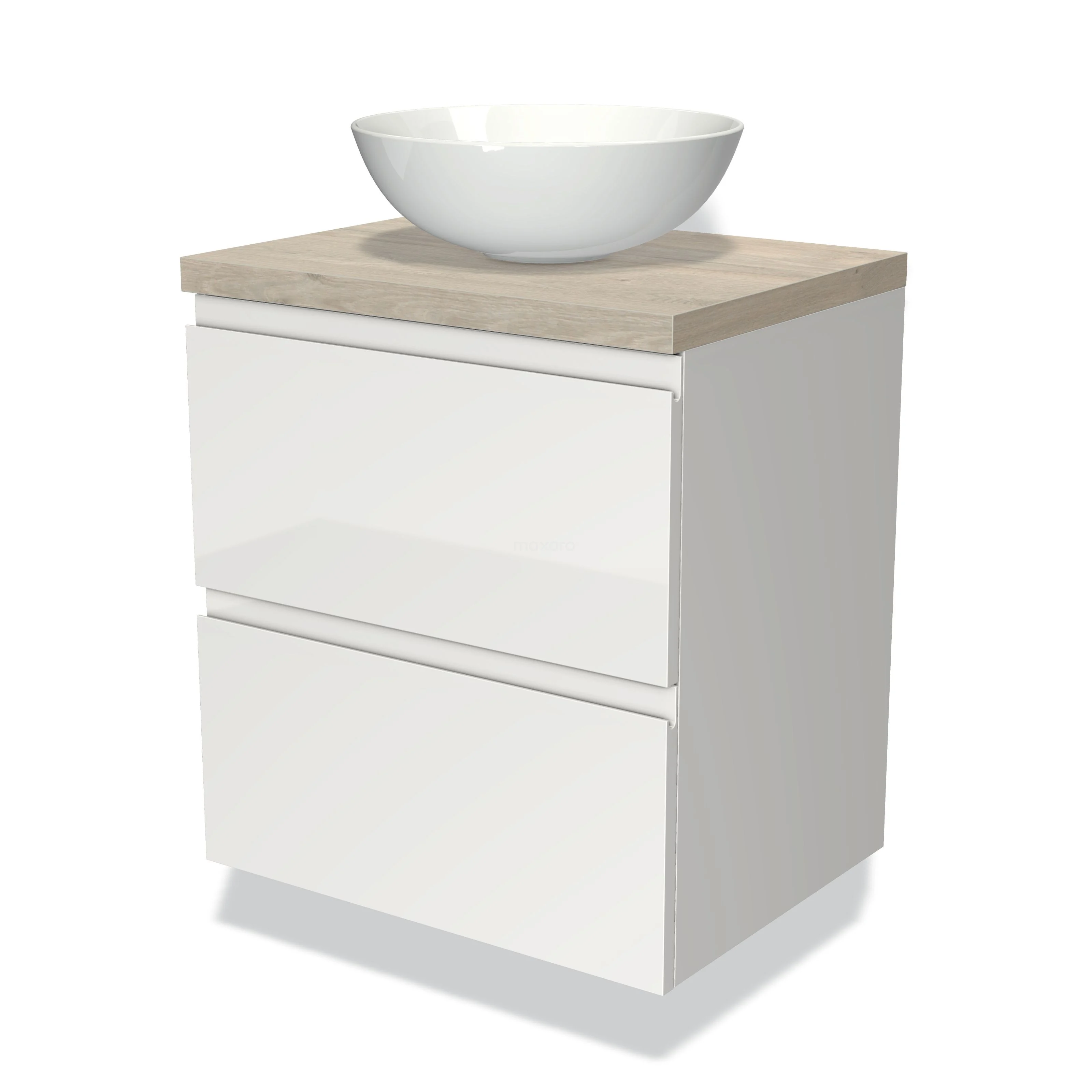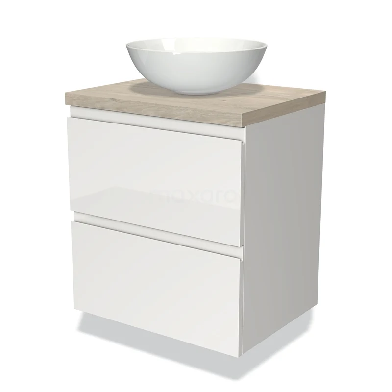 Modulo Plato Badmöbel mit Aufsatzwaschbecken | 60 cm Hochglanz Weiß Grifflos front Hellgraue Eiche blatt 2 übereinanderliegende Schubladen