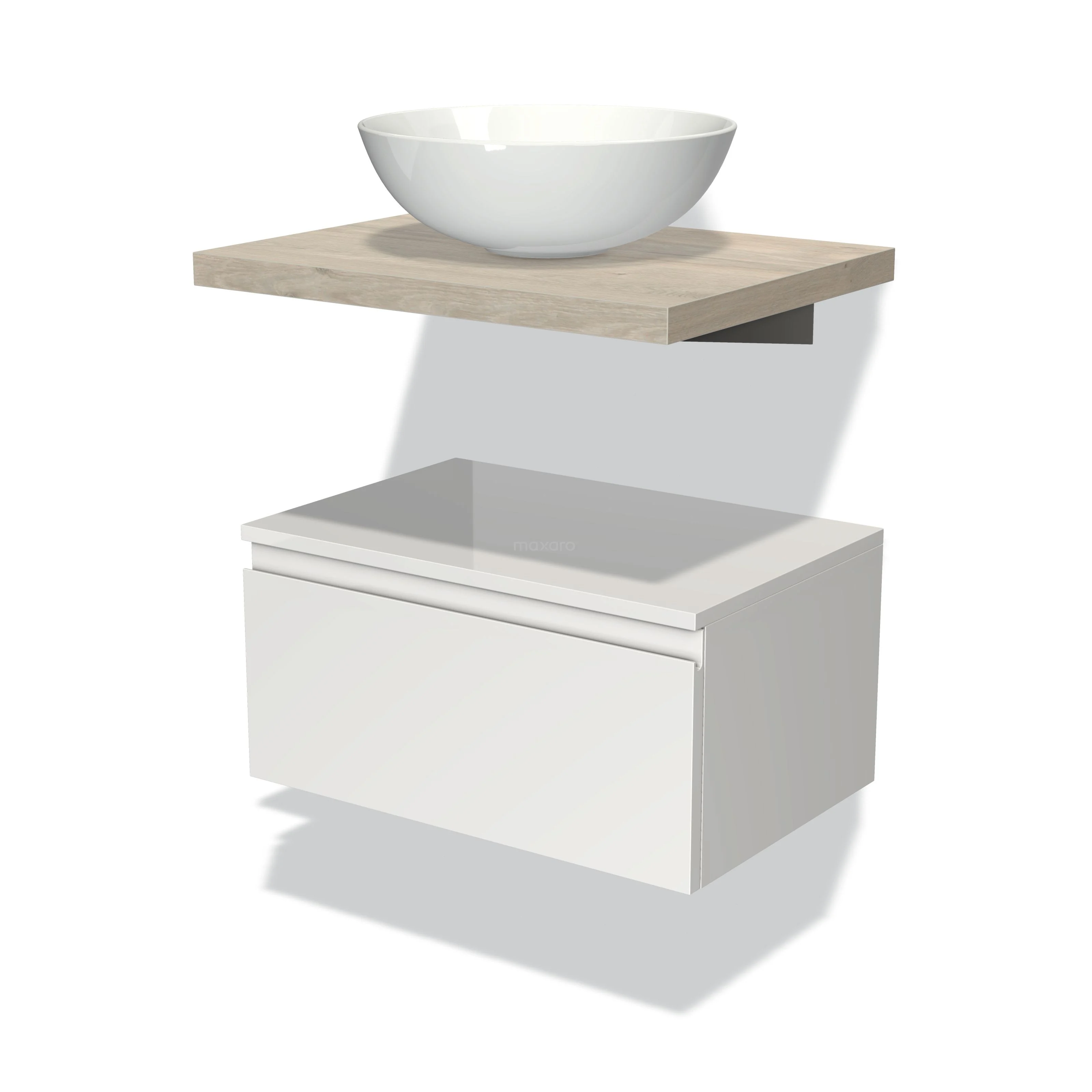 Modulo Plato Badmöbel mit Aufsatzwaschbecken | 60 cm Hochglanz Weiß Grifflos front Hellgraue Eiche blatt Tief hängend