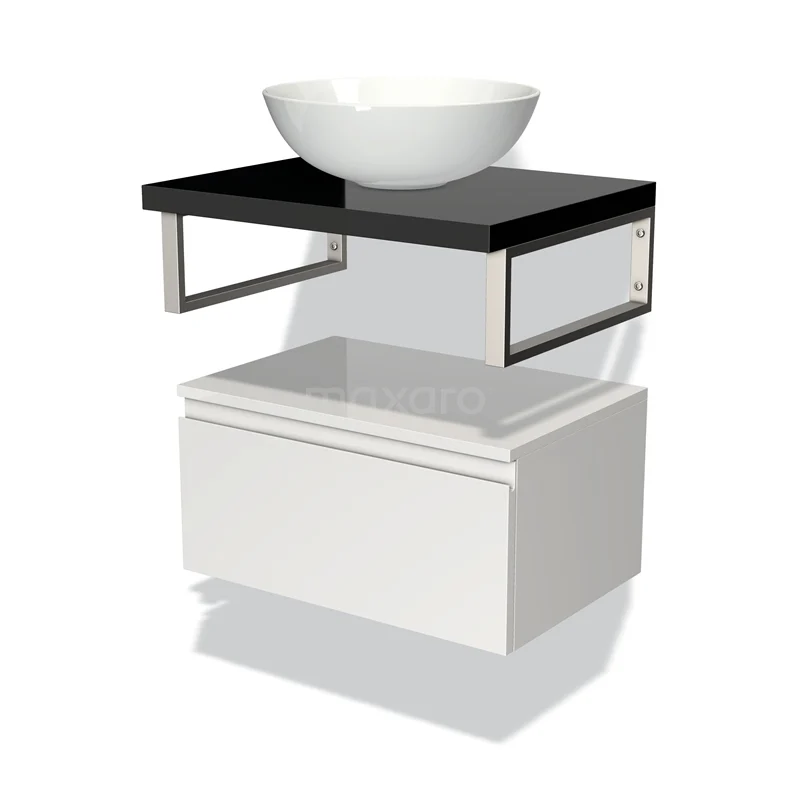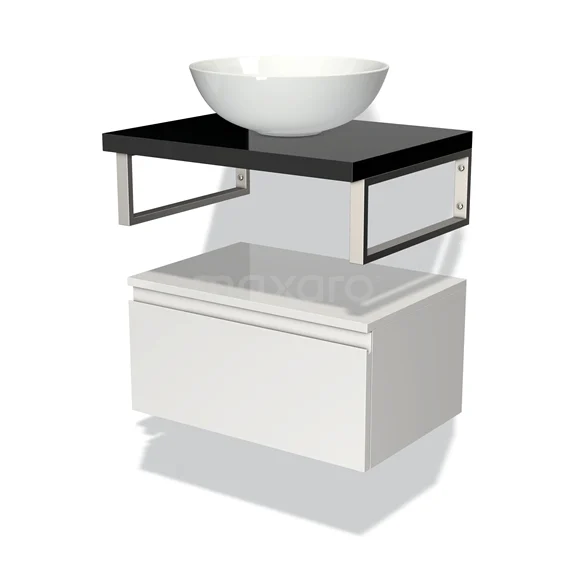 Modulo Plato Badmöbel mit Aufsatzwaschbecken | 60 cm Hochglanz Weiß Grifflos front Hochglanz Schwarz blatt Tief hängend
