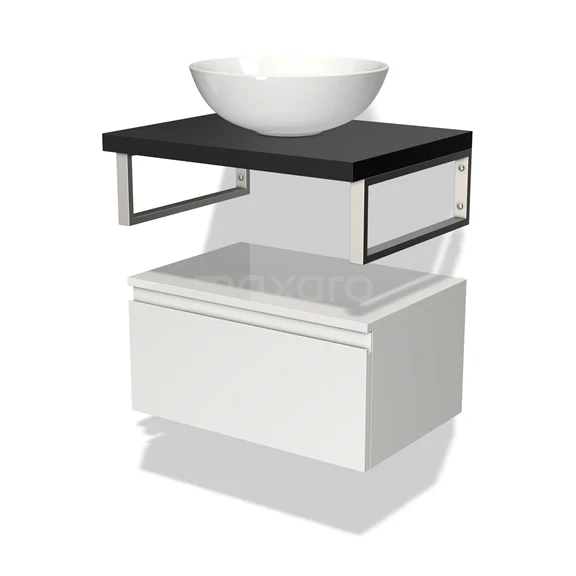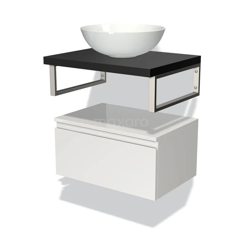 Modulo Plato Badmöbel mit Aufsatzwaschbecken | 60 cm Hochglanz Weiß Grifflos front Matt Schwarz blatt Tief hängend