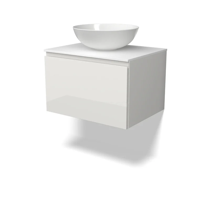 Modulo Plato Badmöbel mit Aufsatzwaschbecken | 60 cm Hochglanz Weiß Grifflos front Solid Surface blatt 1 Schublade