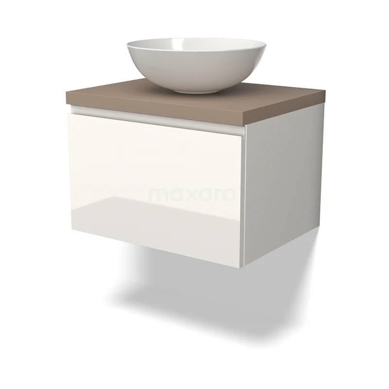 Modulo Plato Badmöbel mit Aufsatzwaschbecken | 60 cm Hochglanz Weiß Grifflos front Taupe blatt 1 Schublade