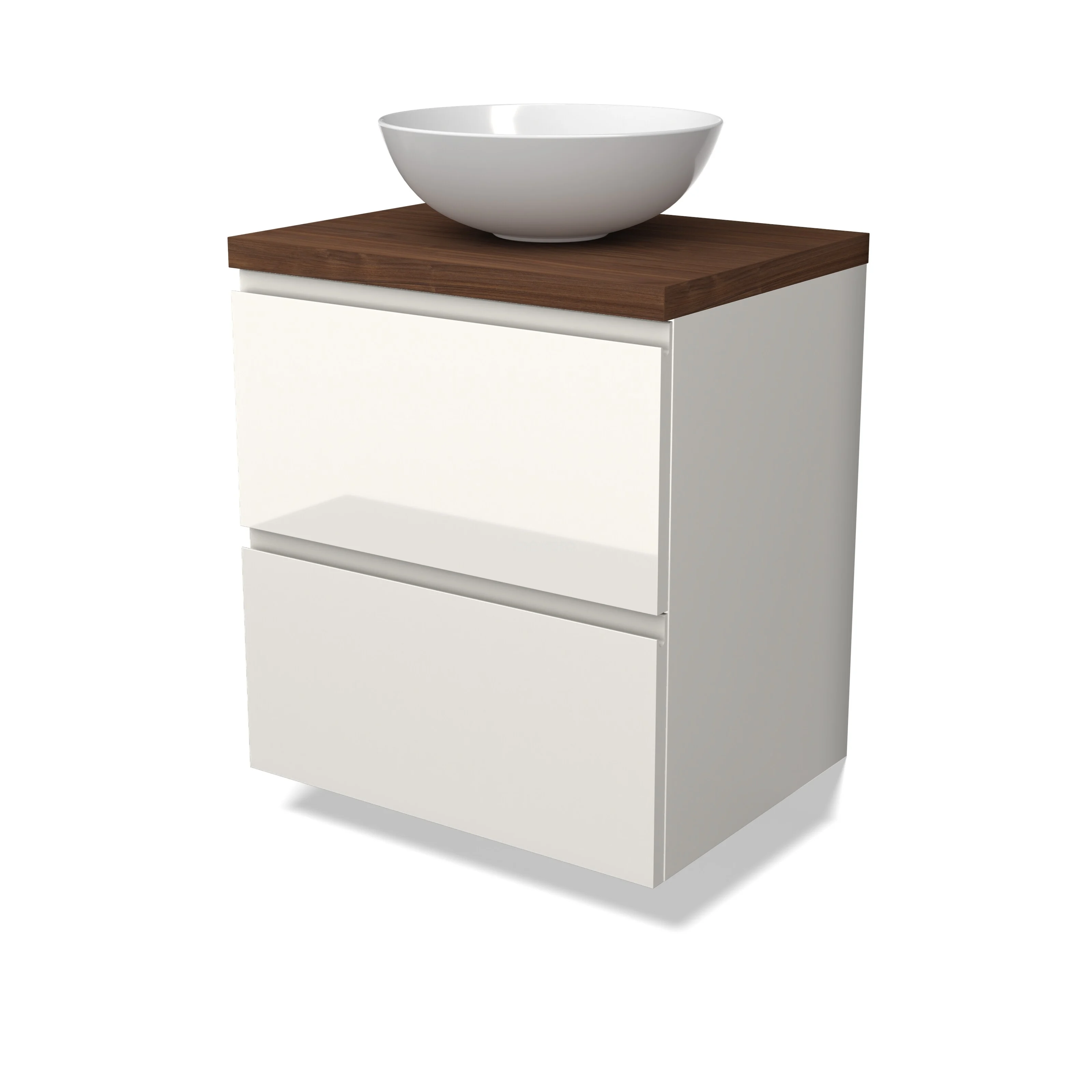 Modulo Plato Badmöbel mit Aufsatzwaschbecken | 60 cm Hochglanz Weiß Grifflos front Walnuss blatt 2 übereinanderliegende Schubladen