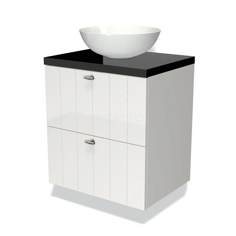 Modulo Plato Badmöbel mit Aufsatzwaschbecken | 60 cm Hochglanz Weiß Lamelle front Hochglanz Schwarz blatt 2 übereinanderliegende Schubladen