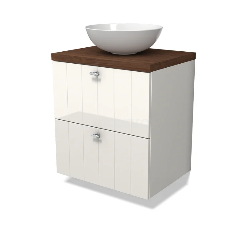 Modulo Plato Badmöbel mit Aufsatzwaschbecken | 60 cm Hochglanz Weiß Lamelle front Walnuss blatt 2 übereinanderliegende Schubladen