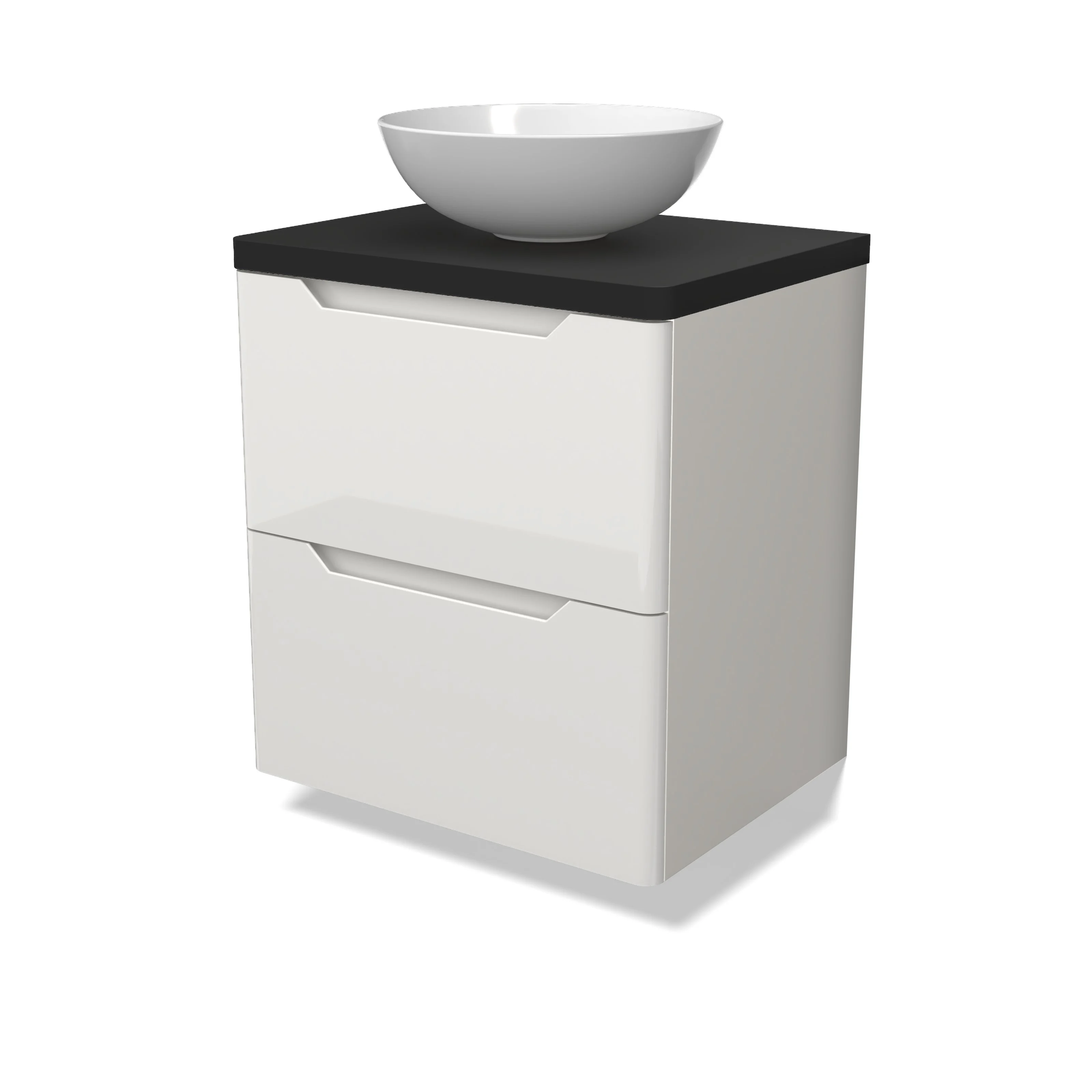 Modulo Plato Badmöbel mit Aufsatzwaschbecken | 60 cm Hochglanz Weiß Rund front Matt Schwarz blatt 2 übereinanderliegende Schubladen BMK17-03108