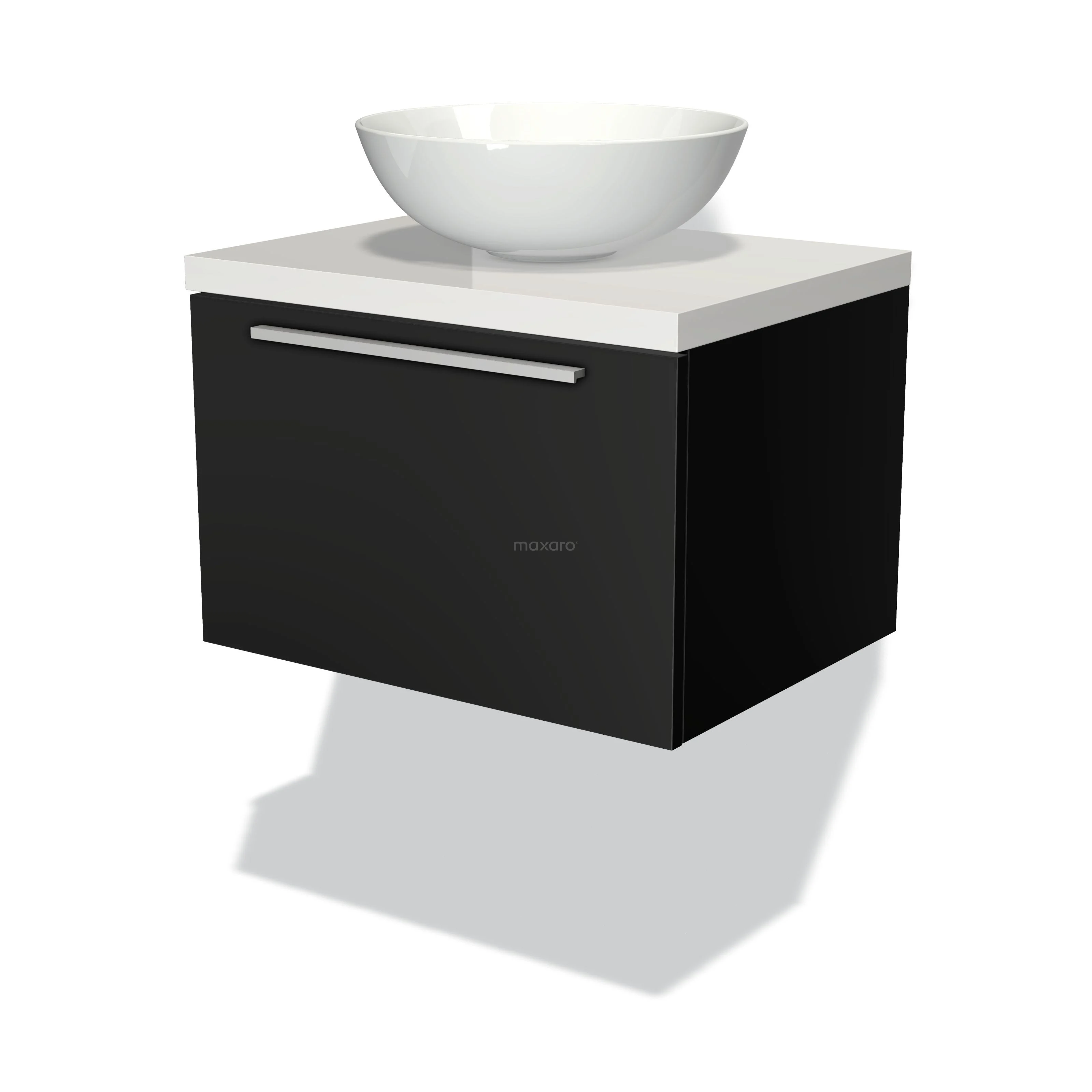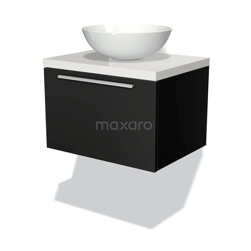 Modulo Plato Badmöbel mit Aufsatzwaschbecken | 60 cm Matt Schwarz Flach front Hochglanz Weiß blatt 1 Schublade