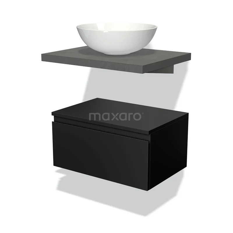 Modulo Plato Badmöbel mit Aufsatzwaschbecken | 60 cm Matt Schwarz Grifflos front Dunkelgrauer Beton blatt Tief hängend