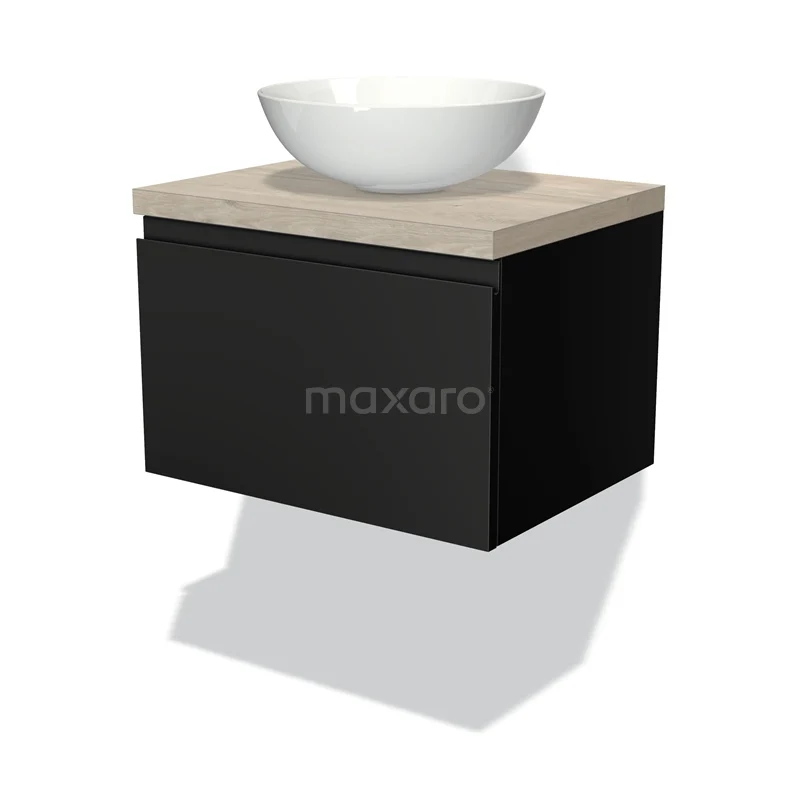 Modulo Plato Badmöbel mit Aufsatzwaschbecken | 60 cm Matt Schwarz Grifflos front Hellgraue Eiche blatt 1 Schublade
