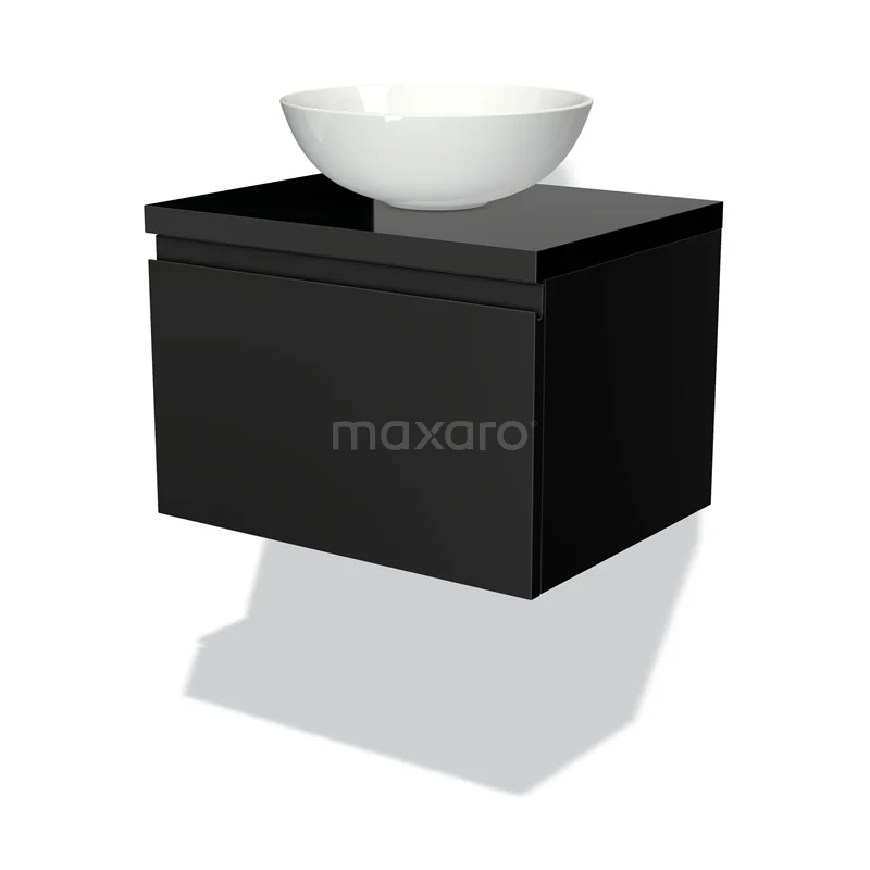 Modulo Plato Badmöbel mit Aufsatzwaschbecken | 60 cm Matt Schwarz Grifflos front Hochglanz Schwarz blatt 1 Schublade