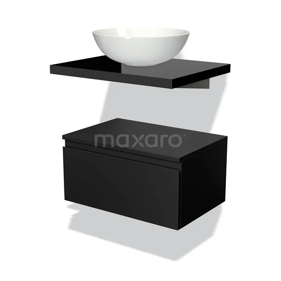 Modulo Plato Badmöbel mit Aufsatzwaschbecken | 60 cm Matt Schwarz Grifflos front Hochglanz Schwarz blatt Tief hängend