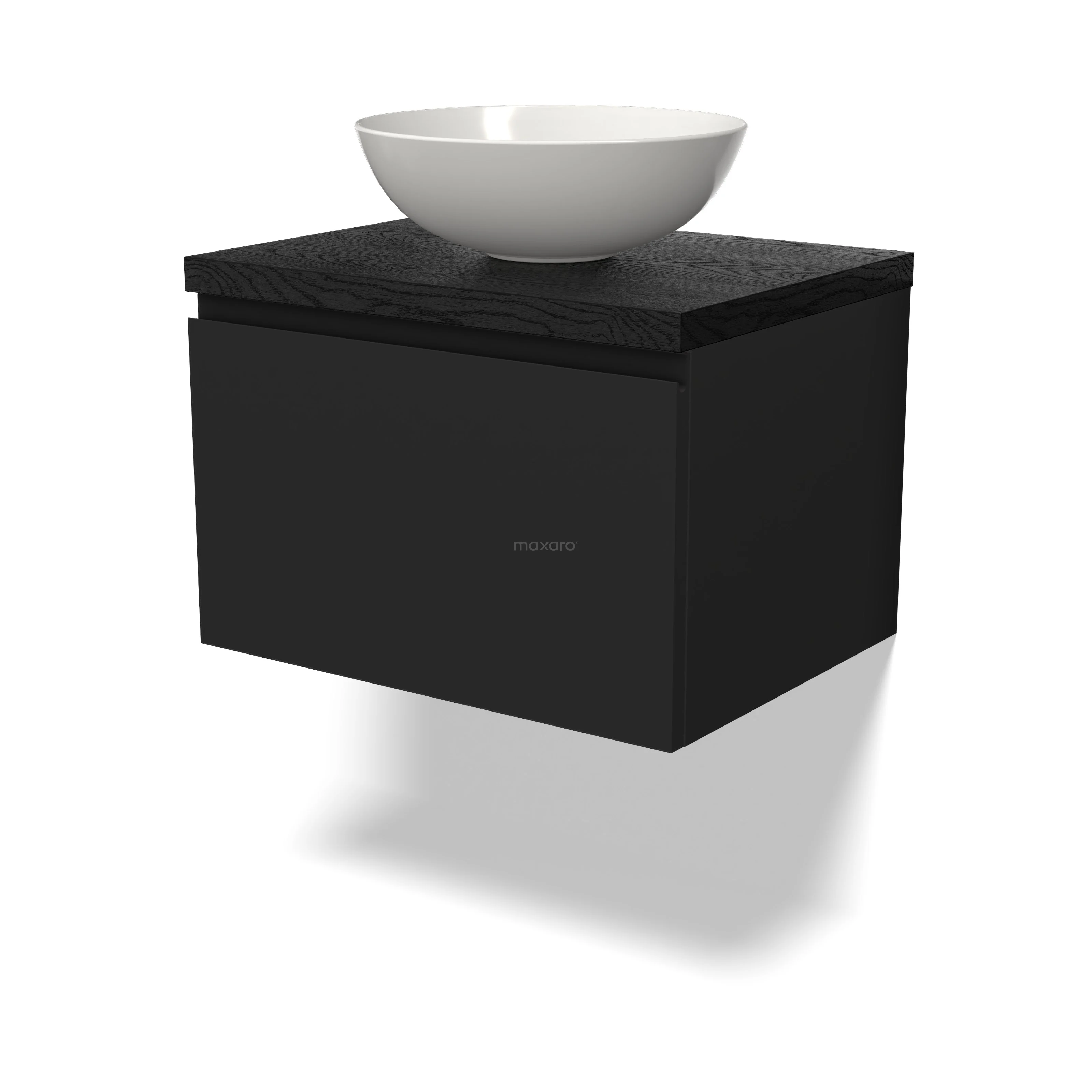 Modulo Plato Badmöbel mit Aufsatzwaschbecken | 60 cm Matt Schwarz Grifflos front Schwarze Eiche blatt 1 Schublade