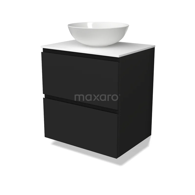 Modulo Plato Badmöbel mit Aufsatzwaschbecken | 60 cm Matt Schwarz Grifflos front Solid Surface blatt 2 übereinanderliegende Schubladen