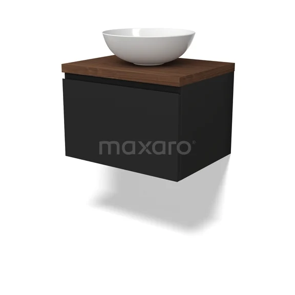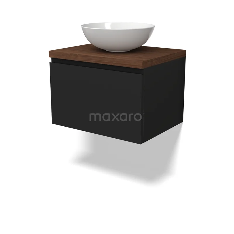 Modulo Plato Badmöbel mit Aufsatzwaschbecken | 60 cm Matt Schwarz Grifflos front Walnuss blatt 1 Schublade