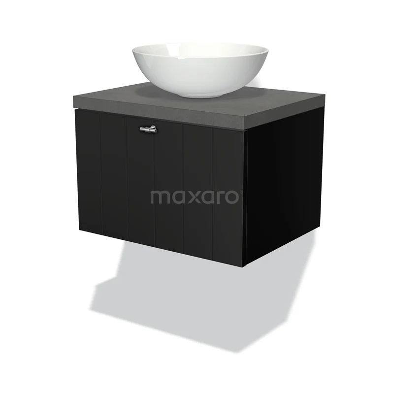 Modulo Plato Badmöbel mit Aufsatzwaschbecken | 60 cm Matt Schwarz Lamelle front Dunkelgrauer Beton blatt 1 Schublade