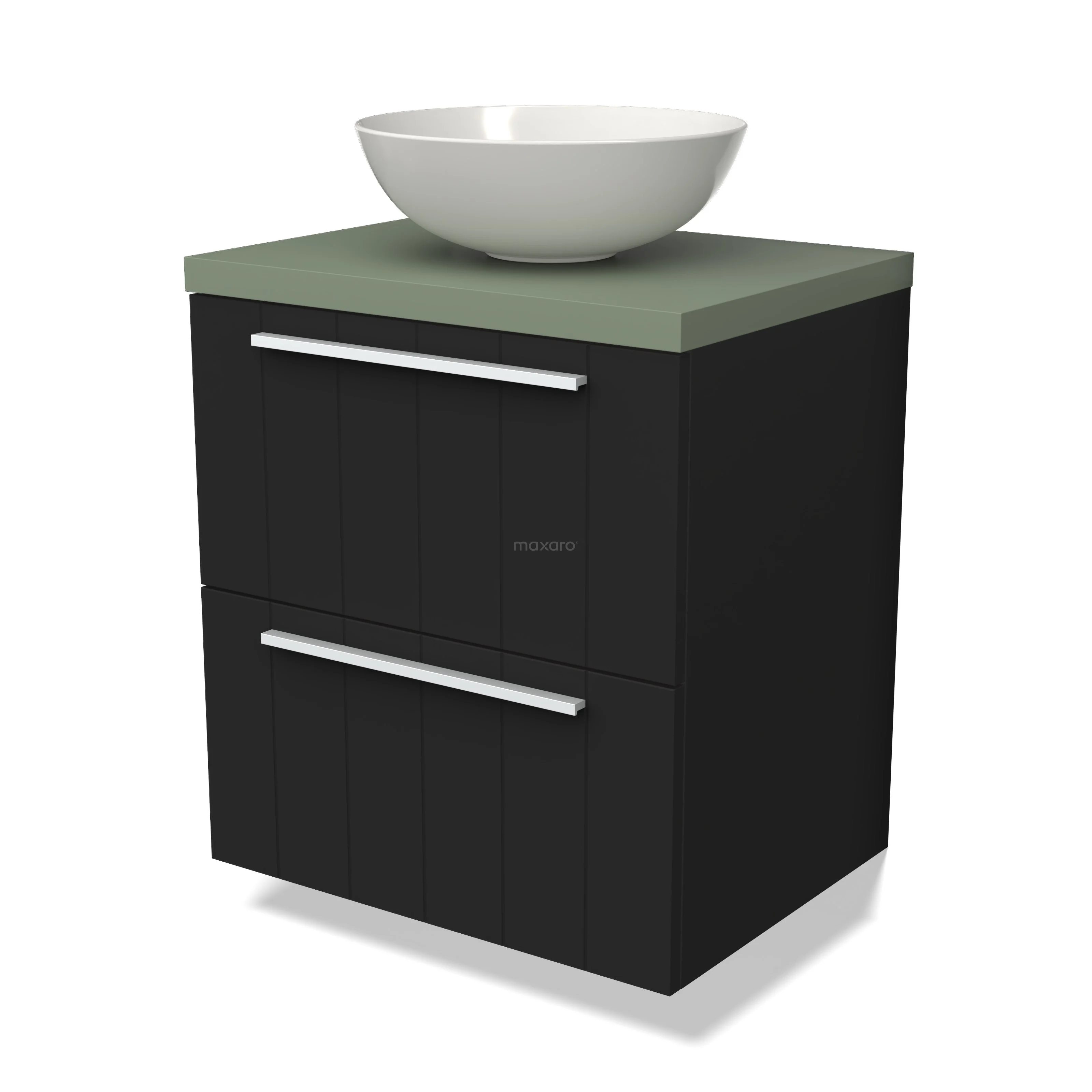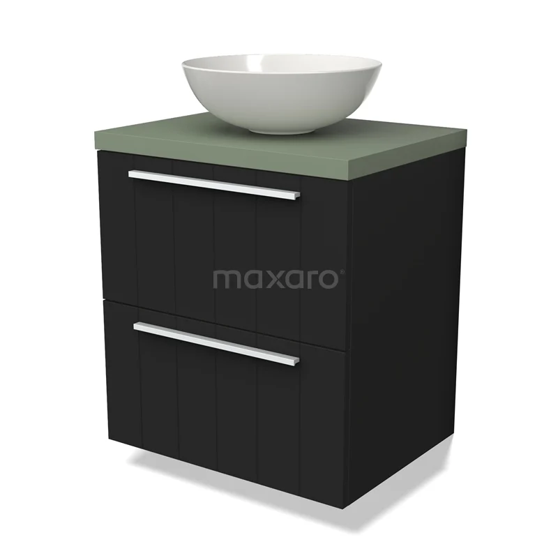 Modulo Plato Badmöbel mit Aufsatzwaschbecken | 60 cm Matt Schwarz Lamelle front Salbeigrün blatt 2 übereinanderliegende Schubladen
