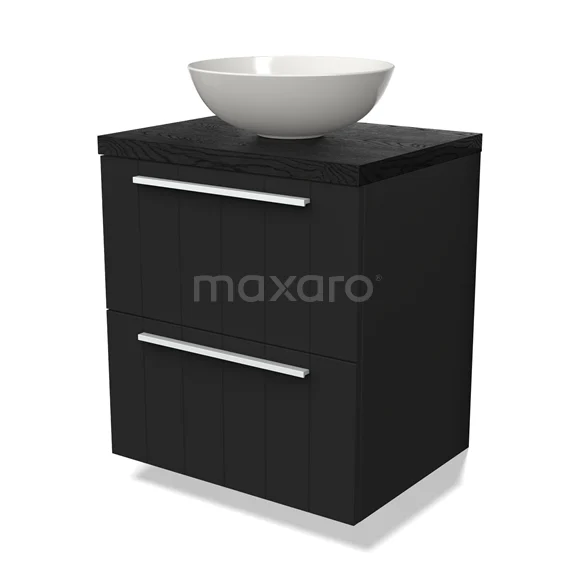 Modulo Plato Badmöbel mit Aufsatzwaschbecken | 60 cm Matt Schwarz Lamelle front Schwarze Eiche blatt 2 übereinanderliegende Schubladen