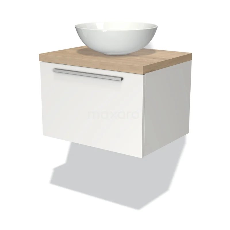 Modulo Plato Badmöbel mit Aufsatzwaschbecken | 60 cm Matt Weiß Flach front Hellbraune Eiche blatt 1 Schublade