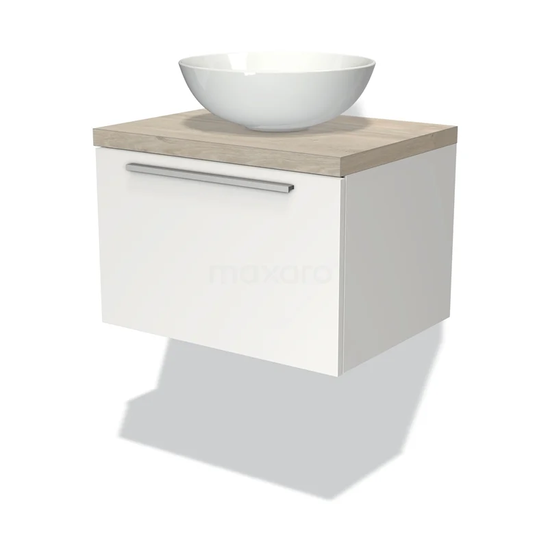 Modulo Plato Badmöbel mit Aufsatzwaschbecken | 60 cm Matt Weiß Flach front Hellgraue Eiche blatt 1 Schublade
