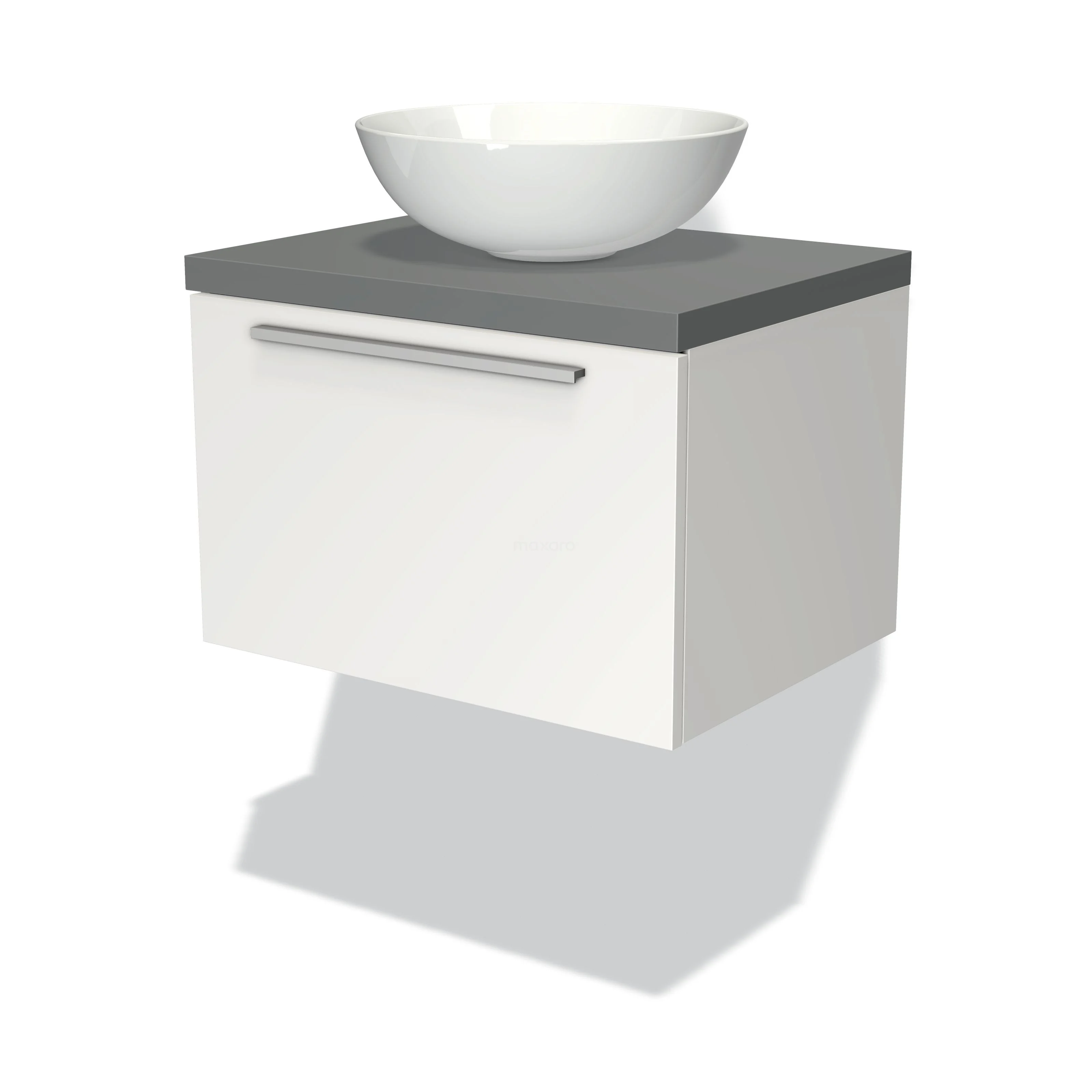 Modulo Plato Badmöbel mit Aufsatzwaschbecken | 60 cm Matt Weiß Flach front Mittelgrau blatt 1 Schublade
