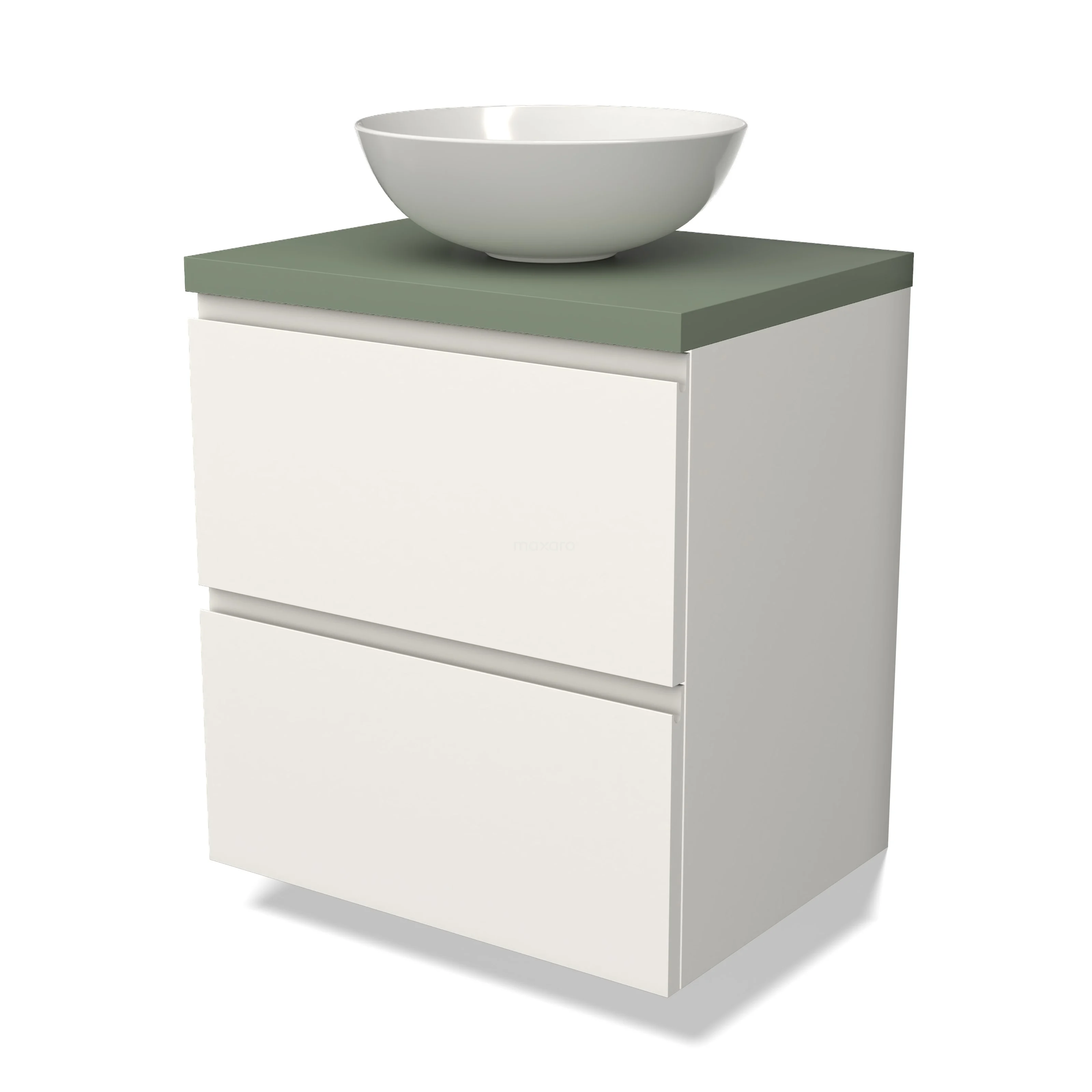 Modulo Plato Badmöbel mit Aufsatzwaschbecken | 60 cm Matt Weiß Grifflos front Salbeigrün blatt 2 übereinanderliegende Schubladen