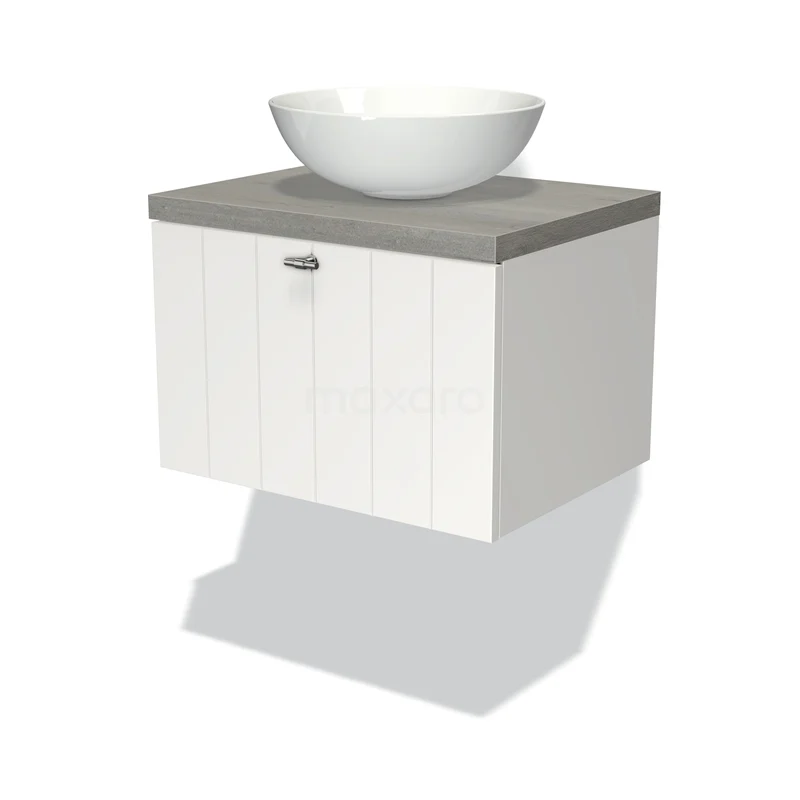 Modulo Plato Badmöbel mit Aufsatzwaschbecken | 60 cm Matt Weiß Lamelle front Graue Eiche blatt 1 Schublade