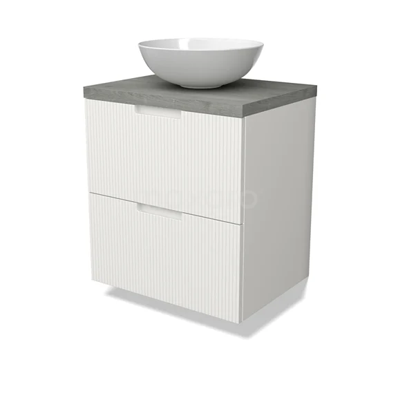 Modulo Plato Badmöbel mit Aufsatzwaschbecken | 60 cm Matt Weiß Linie front Graue Eiche blatt 2 übereinanderliegende Schubladen
