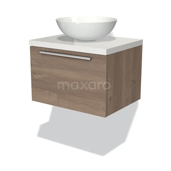 Modulo Plato Badmöbel mit Aufsatzwaschbecken | 60 cm Mittelbraune Eiche Flach front Hochglanz Weiß blatt 1 Schublade