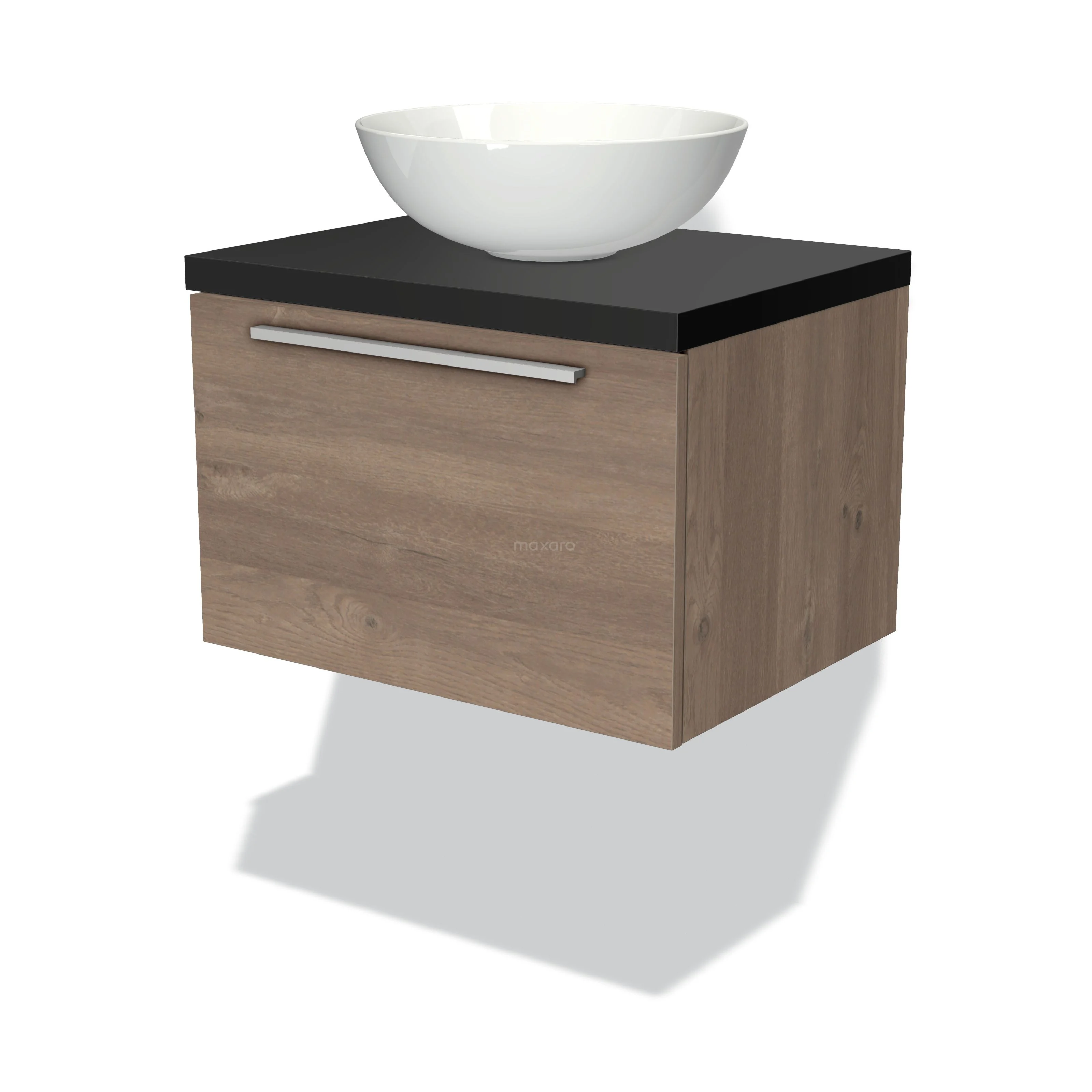 Modulo Plato Badmöbel mit Aufsatzwaschbecken | 60 cm Mittelbraune Eiche Flach front Matt Schwarz blatt 1 Schublade