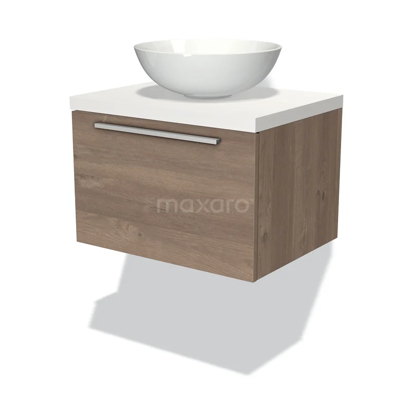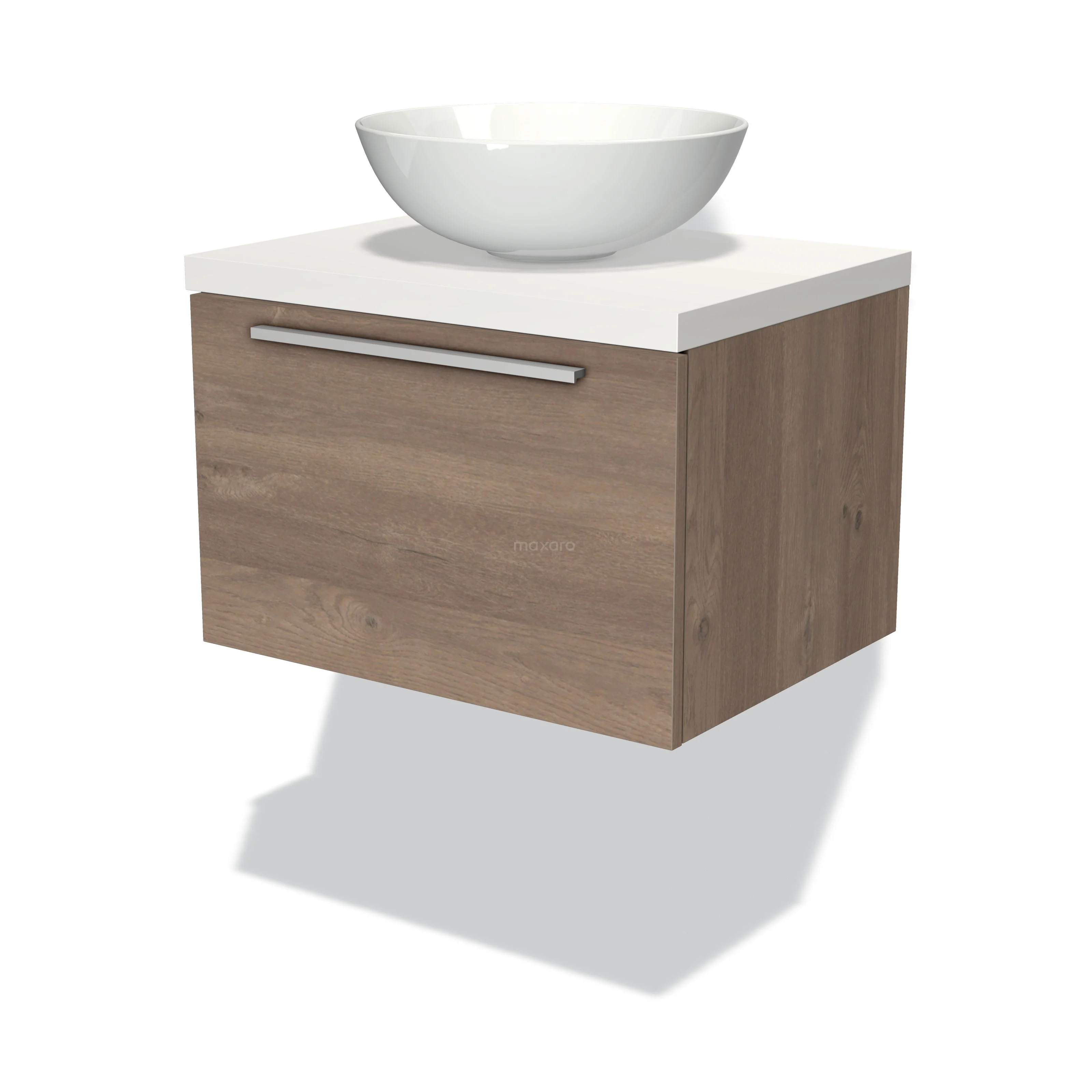 Modulo Plato Badmöbel mit Aufsatzwaschbecken | 60 cm Mittelbraune Eiche Flach front Matt Weiß blatt 1 Schublade