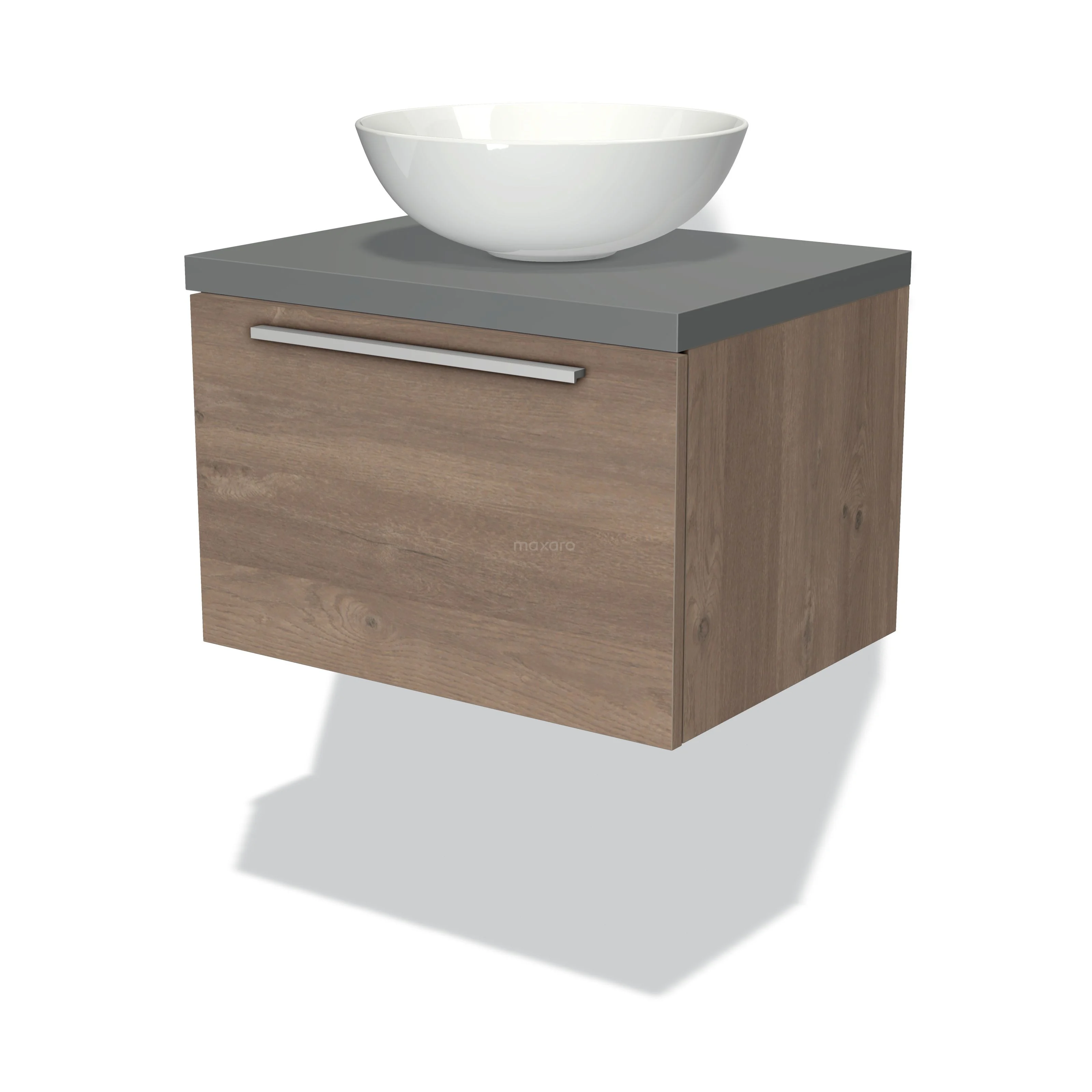 Modulo Plato Badmöbel mit Aufsatzwaschbecken | 60 cm Mittelbraune Eiche Flach front Mittelgrau blatt 1 Schublade