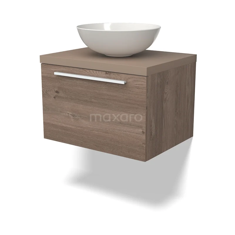 Modulo Plato Badmöbel mit Aufsatzwaschbecken | 60 cm Mittelbraune Eiche Flach front Taupe blatt 1 Schublade