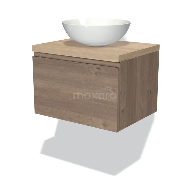 Modulo Plato Badmöbel mit Aufsatzwaschbecken | 60 cm Mittelbraune Eiche Grifflos front Hellbraune Eiche blatt 1 Schublade