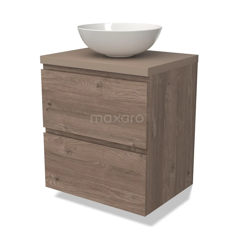 Modulo Plato Badmöbel mit Aufsatzwaschbecken | 60 cm Mittelbraune Eiche Grifflos front Taupe blatt 2 übereinanderliegende Schubladen