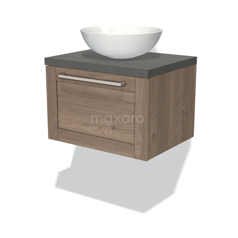 Modulo Plato Badmöbel mit Aufsatzwaschbecken | 60 cm Mittelbraune Eiche Rahmen front Dunkelgrauer Beton blatt 1 Schublade