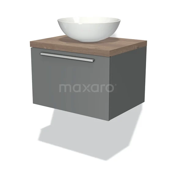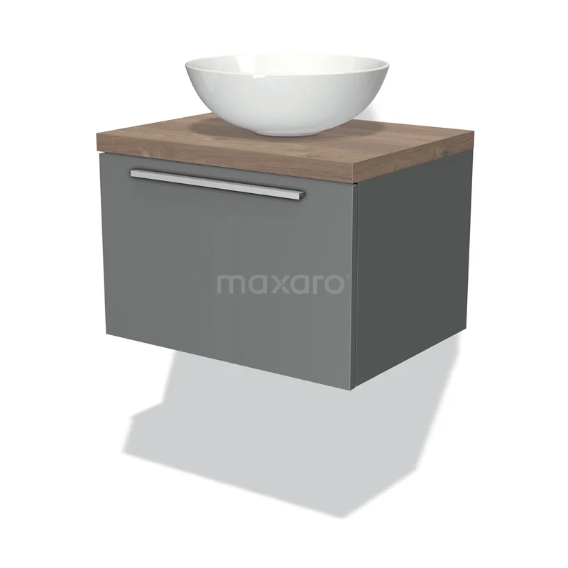 Modulo Plato Badmöbel mit Aufsatzwaschbecken | 60 cm Mittelgrau Flach front Mittelbraune Eiche blatt 1 Schublade