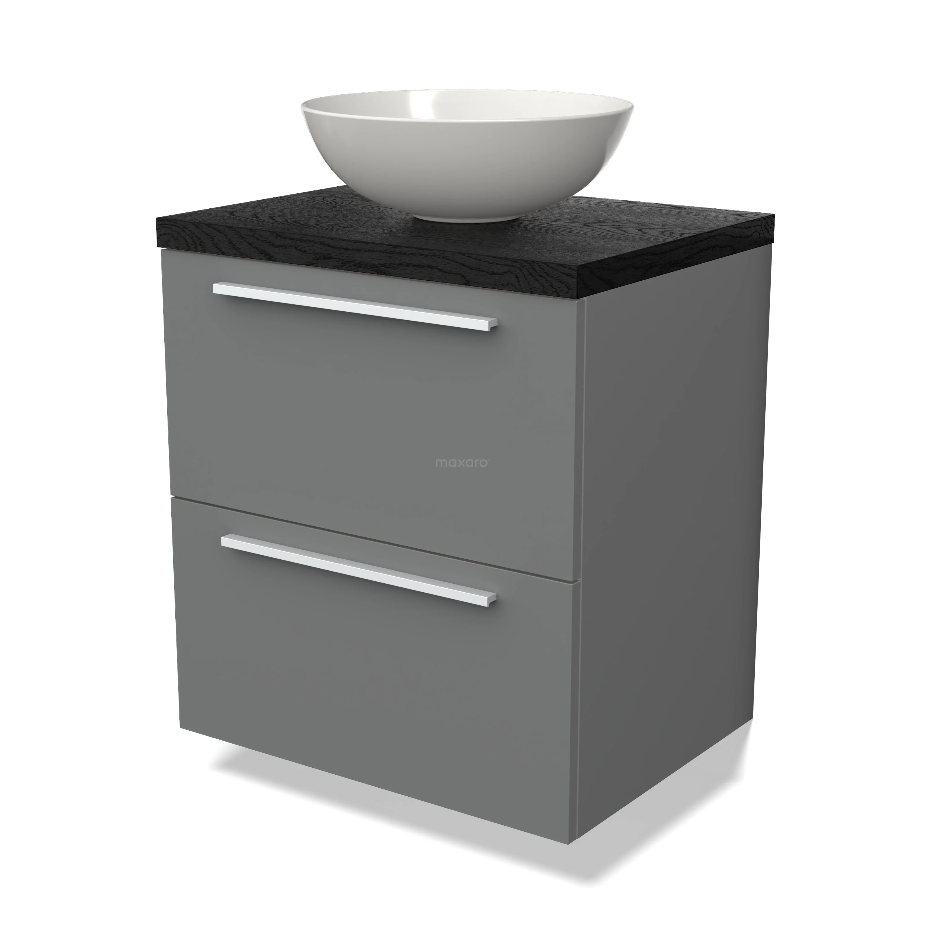 Modulo Plato Badmöbel mit Aufsatzwaschbecken | 60 cm Mittelgrau Flach front Schwarze Eiche blatt 2 übereinanderliegende Schubladen
