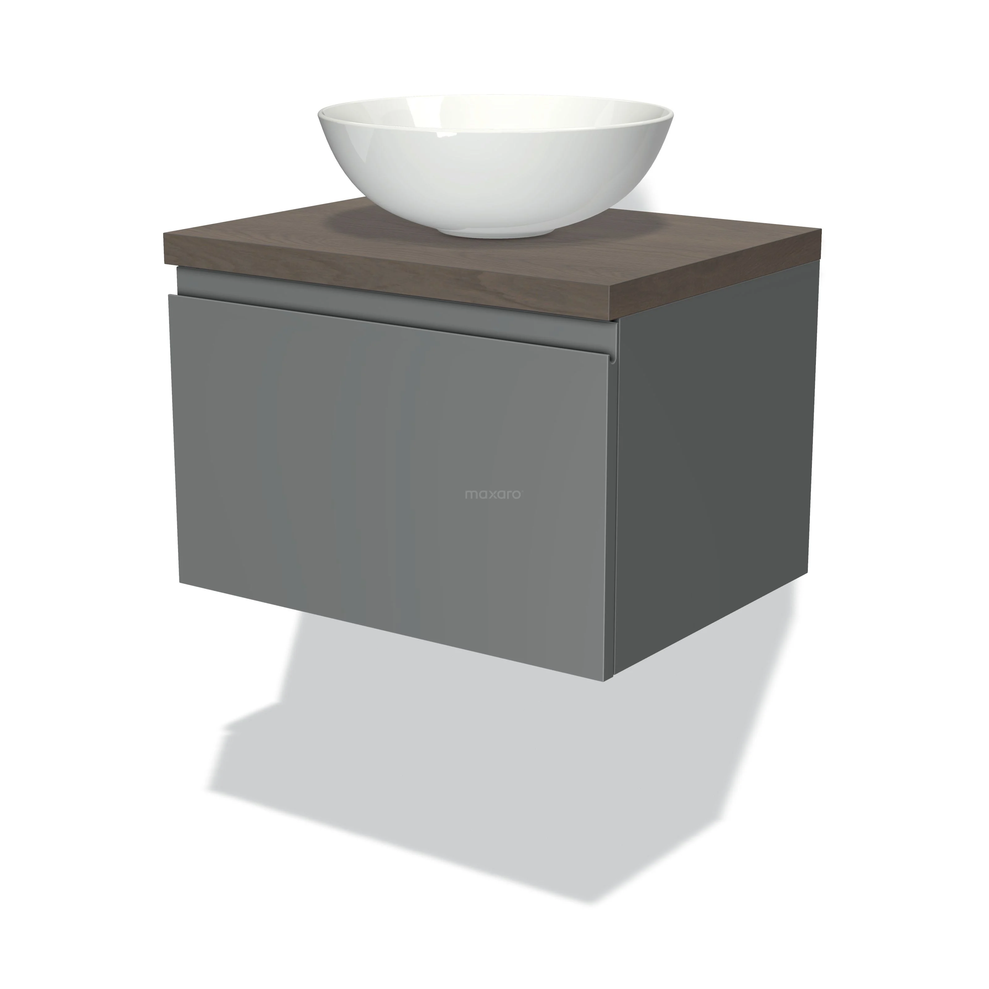 Modulo Plato Badmöbel mit Aufsatzwaschbecken | 60 cm Mittelgrau Grifflos front Dunkelbraune Eiche blatt 1 Schublade