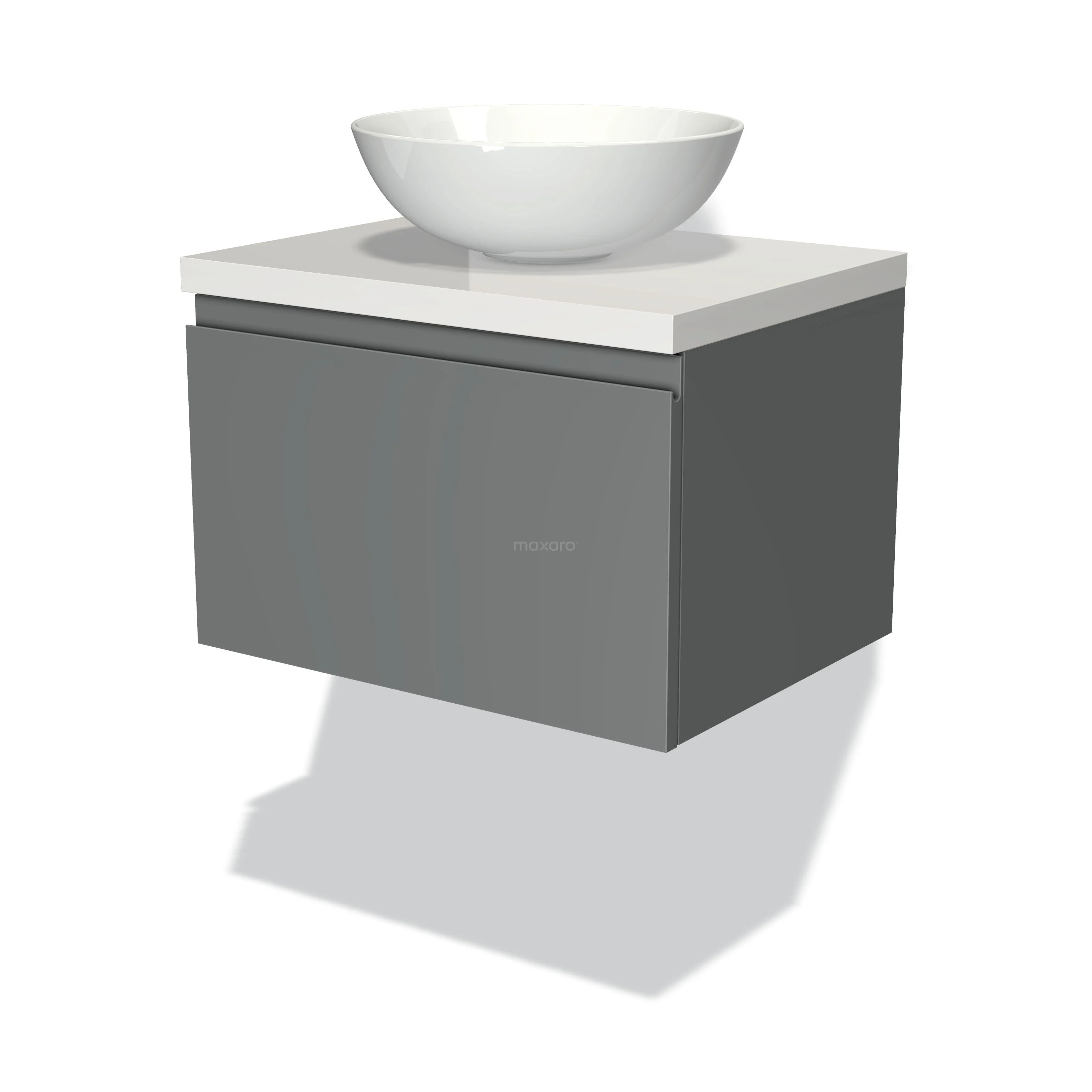 Modulo Plato Badmöbel mit Aufsatzwaschbecken | 60 cm Mittelgrau Grifflos front Hochglanz Weiß blatt 1 Schublade