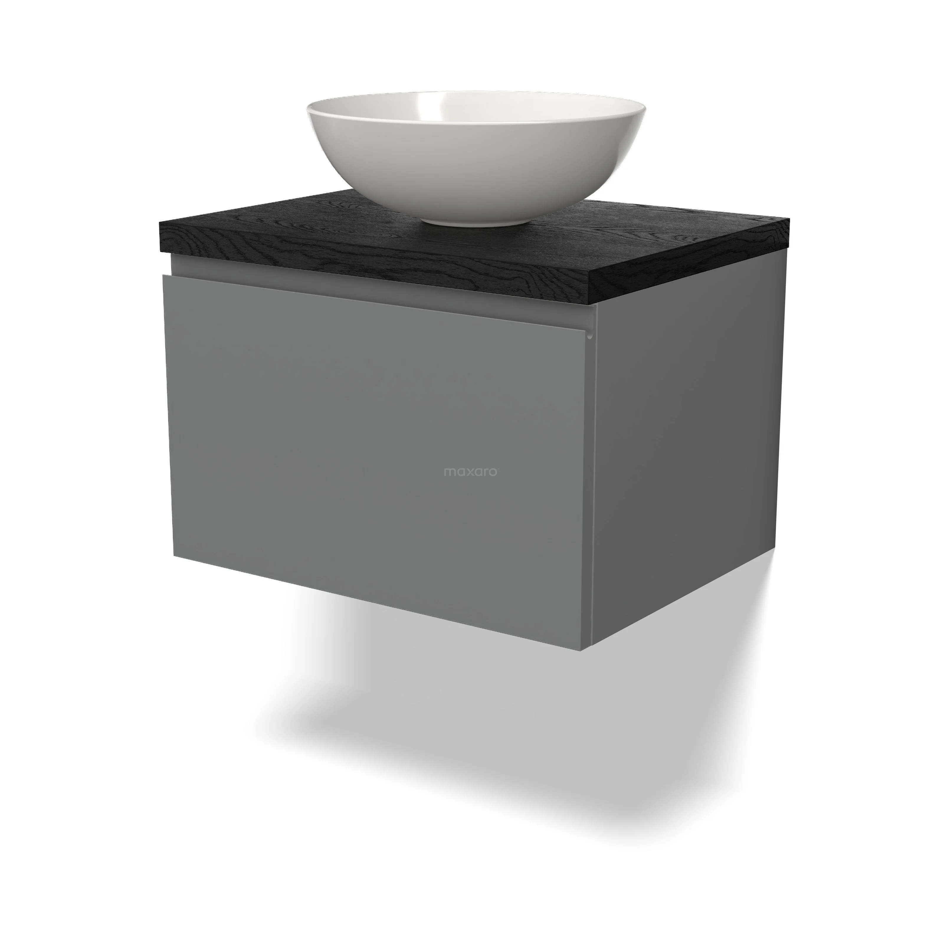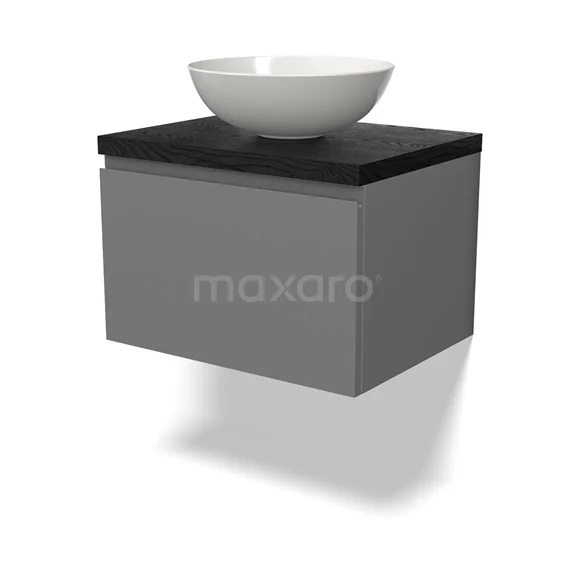 Modulo Plato Badmöbel mit Aufsatzwaschbecken | 60 cm Mittelgrau Grifflos front Schwarze Eiche blatt 1 Schublade