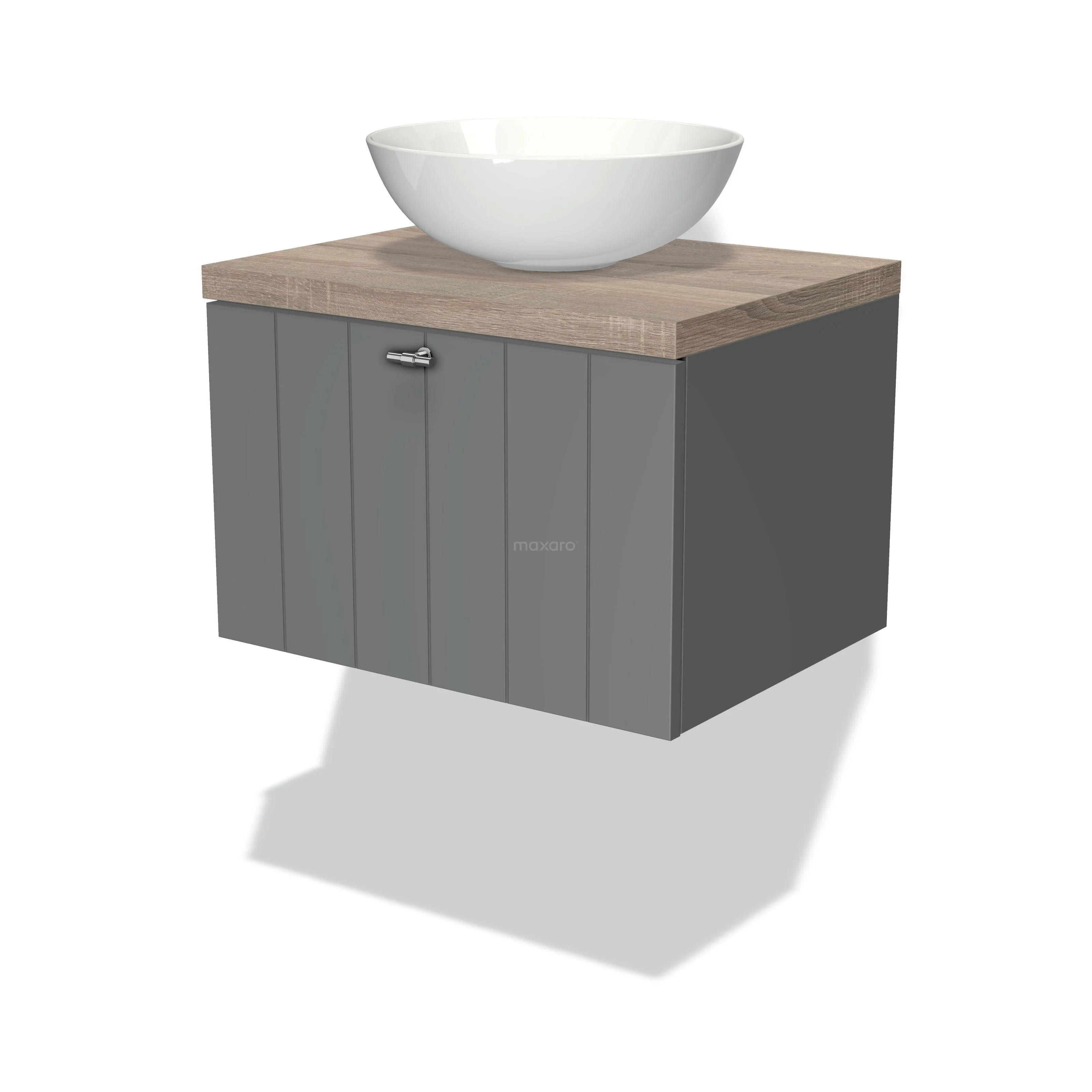 Modulo Plato Badmöbel mit Aufsatzwaschbecken | 60 cm Mittelgrau Lamelle front Eiche blatt 1 Schublade