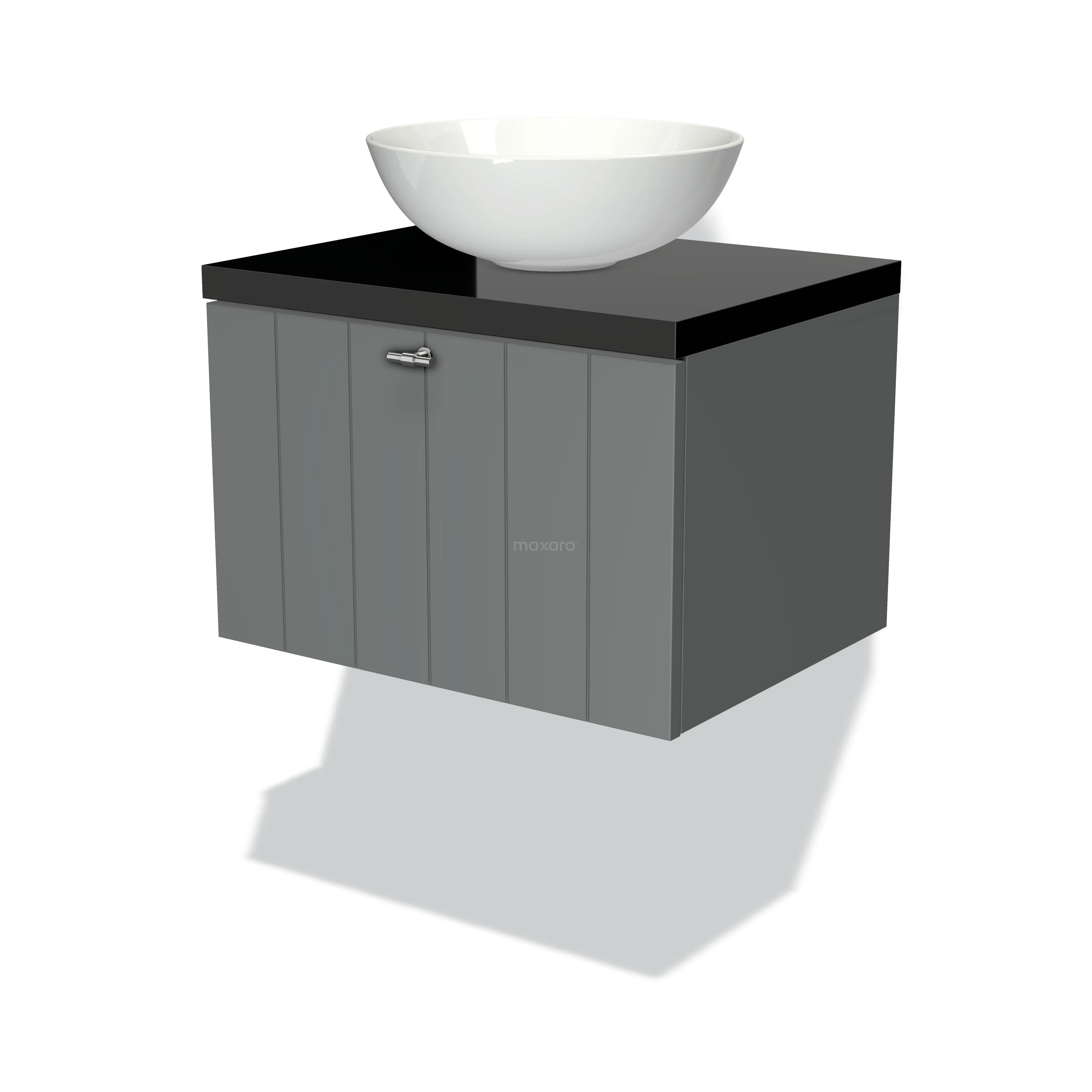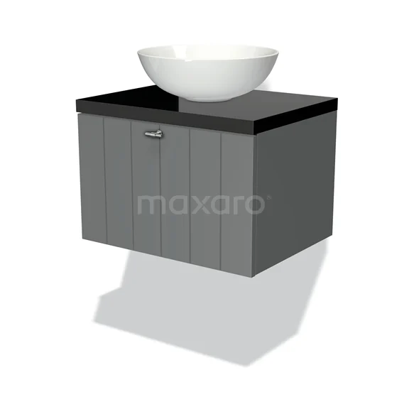 Modulo Plato Badmöbel mit Aufsatzwaschbecken | 60 cm Mittelgrau Lamelle front Hochglanz Schwarz blatt 1 Schublade