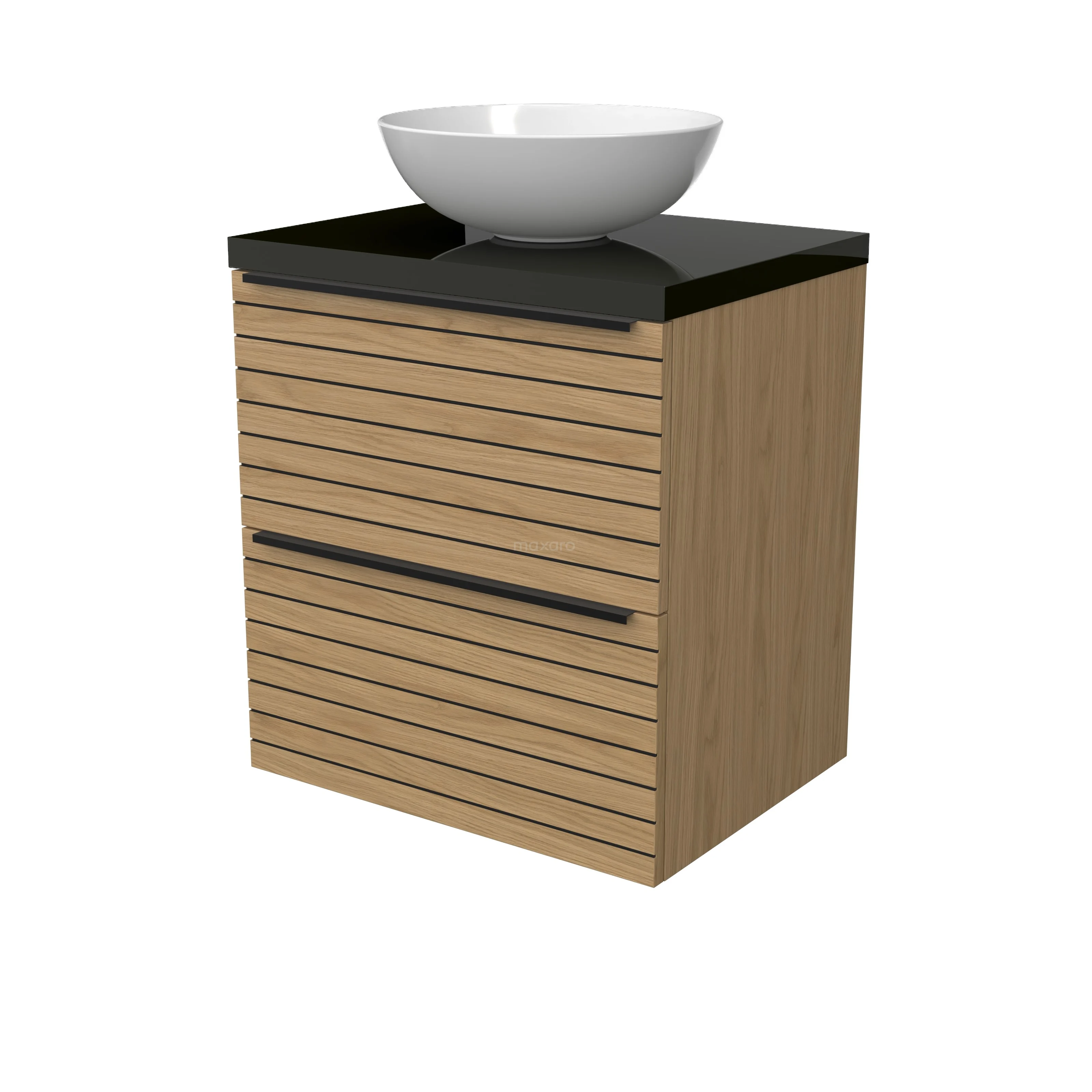 Modulo Plato Badmöbel mit Aufsatzwaschbecken | 60 cm Natürliches Furnier Streifen front Hochglanz Schwarz blatt 2 übereinanderliegende Schubladen