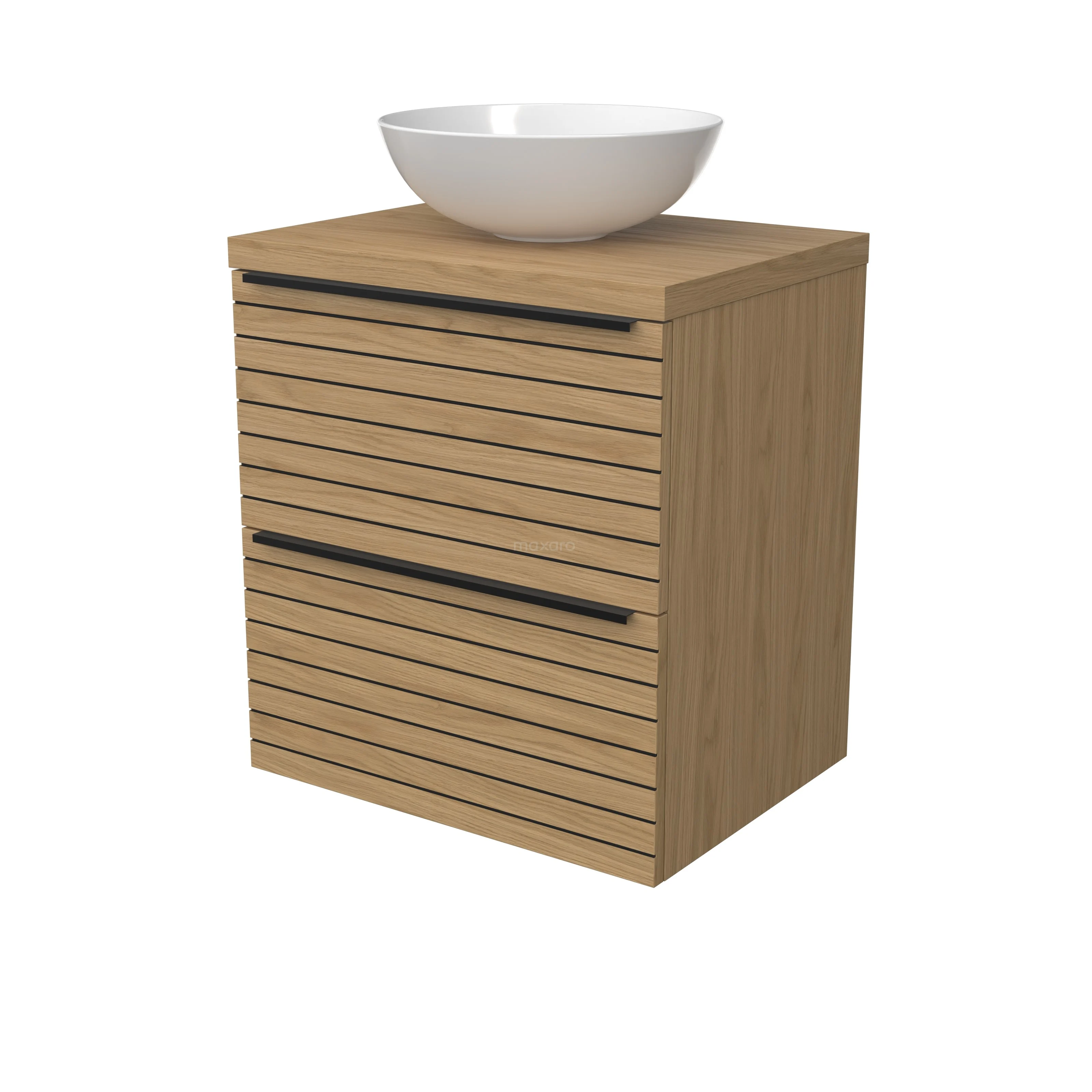 Modulo Plato Badmöbel mit Aufsatzwaschbecken | 60 cm Natürliches Furnier Streifen front Natürliches Furnier blatt 2 übereinanderliegende Schubladen