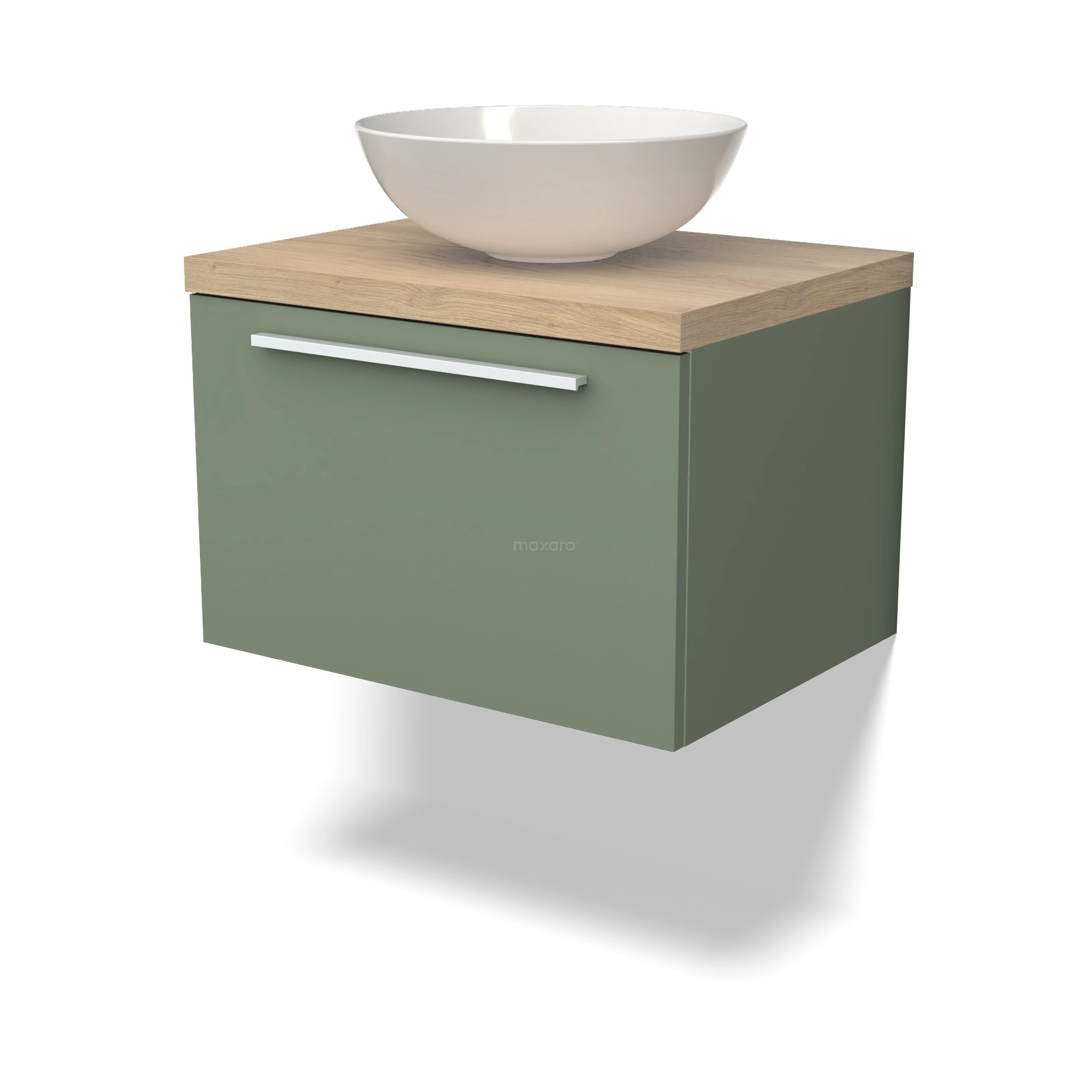 Modulo Plato Badmöbel mit Aufsatzwaschbecken | 60 cm Salbeigrün Flach front Hellbraune Eiche blatt 1 Schublade