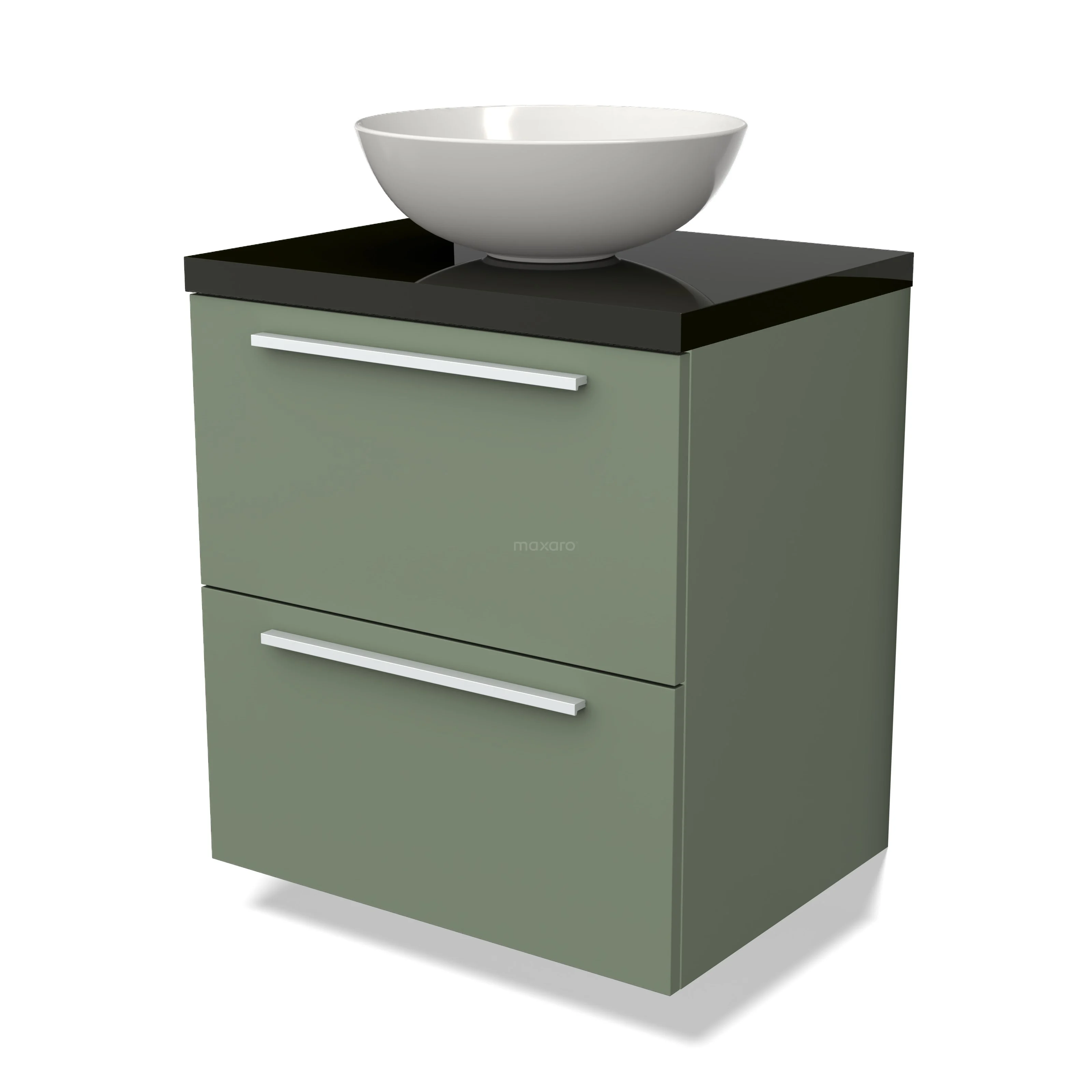 Modulo Plato Badmöbel mit Aufsatzwaschbecken | 60 cm Salbeigrün Flach front Hochglanz Schwarz blatt 2 übereinanderliegende Schubladen