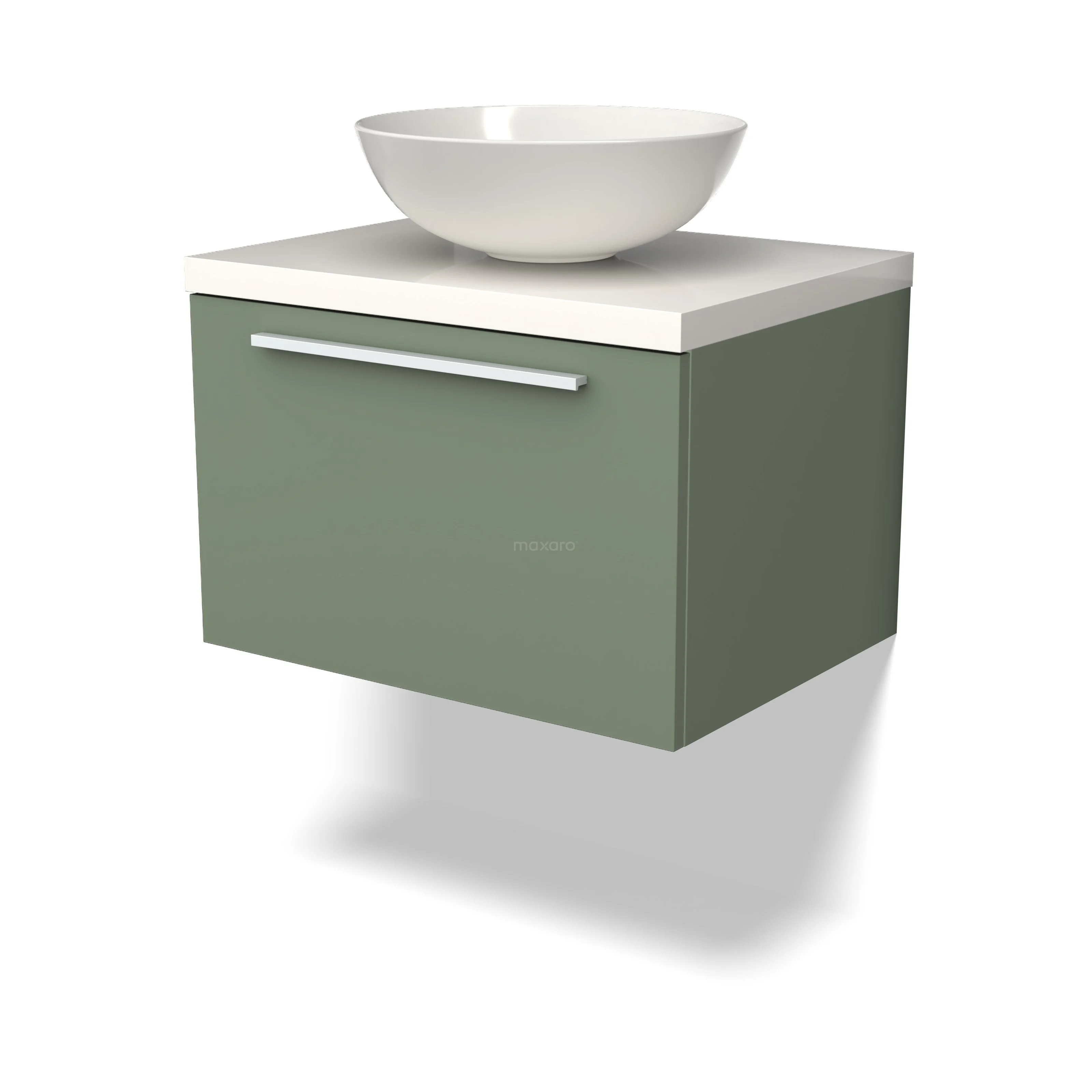 Modulo Plato Badmöbel mit Aufsatzwaschbecken | 60 cm Salbeigrün Flach front Hochglanz Weiß blatt 1 Schublade