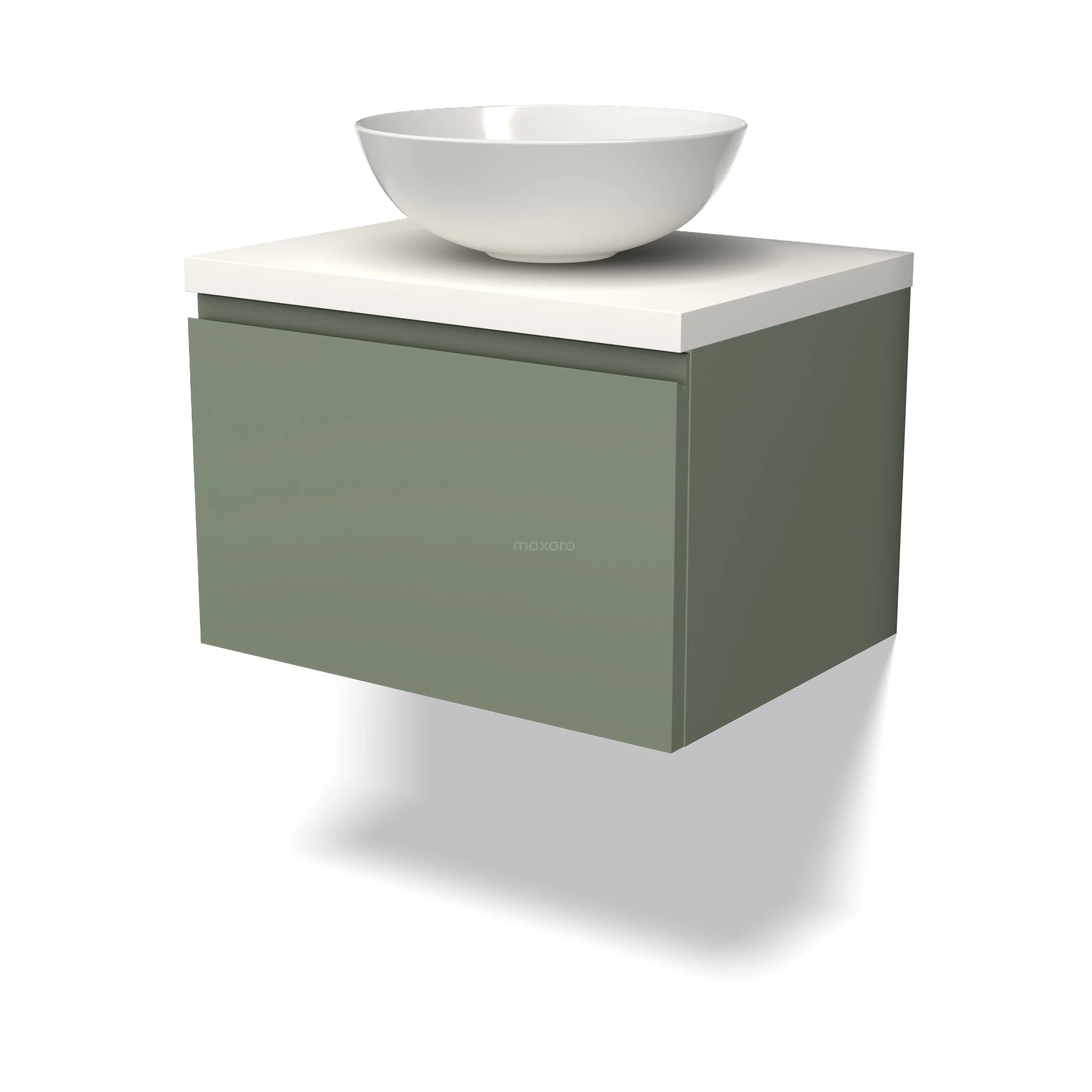 Modulo Plato Badmöbel mit Aufsatzwaschbecken | 60 cm Salbeigrün Grifflos front Matt Weiß blatt 1 Schublade