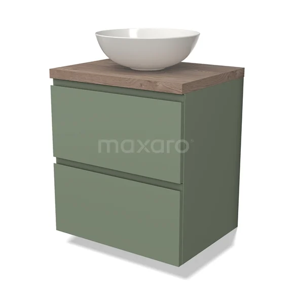 Modulo Plato Badmöbel mit Aufsatzwaschbecken | 60 cm Salbeigrün Grifflos front Mittelbraune Eiche blatt 2 übereinanderliegende Schubladen