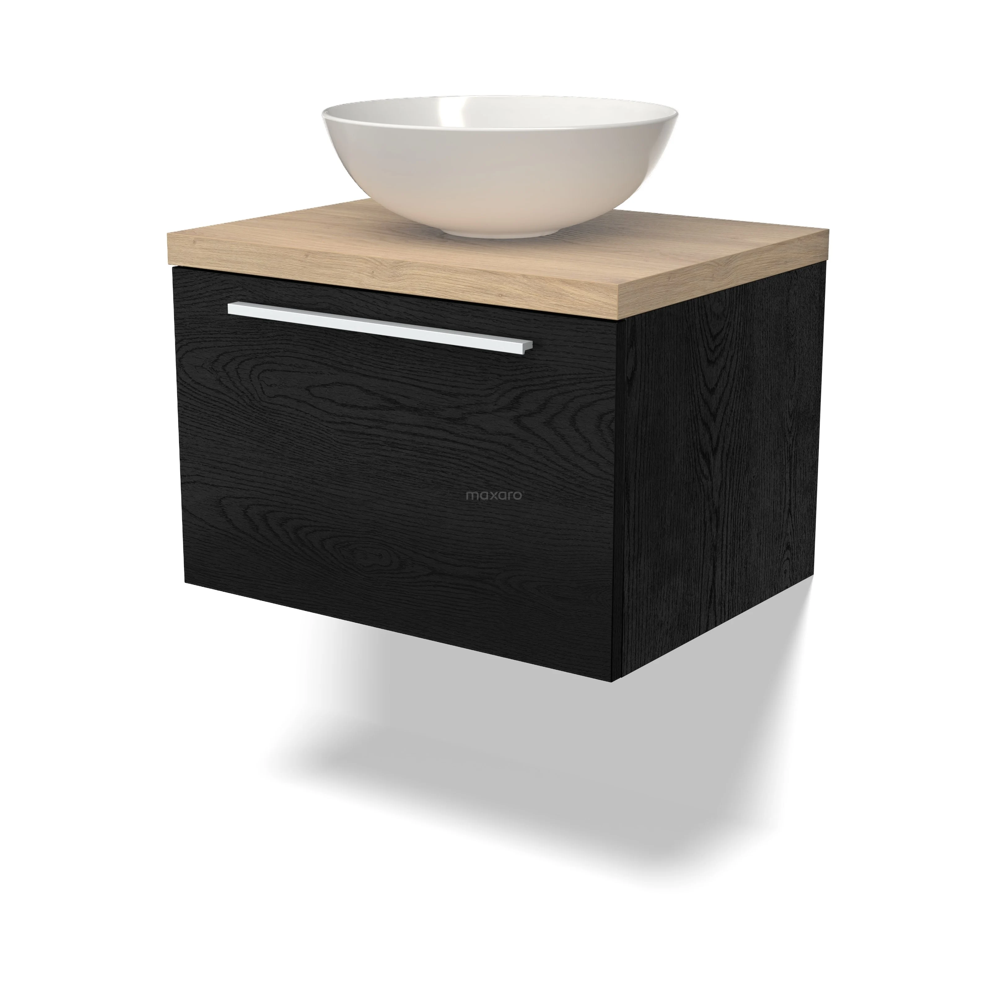 Modulo Plato Badmöbel mit Aufsatzwaschbecken | 60 cm Schwarze Eiche Flach front Hellbraune Eiche blatt 1 Schublade